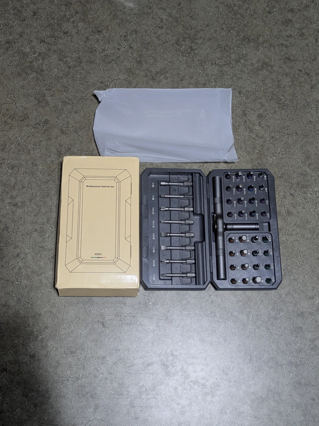 This is a 42-in-1 multipurpose ratchet set. It includes a variety of bits and a handle. Comes with a storage case. Useful for household repairs and DIY projects!