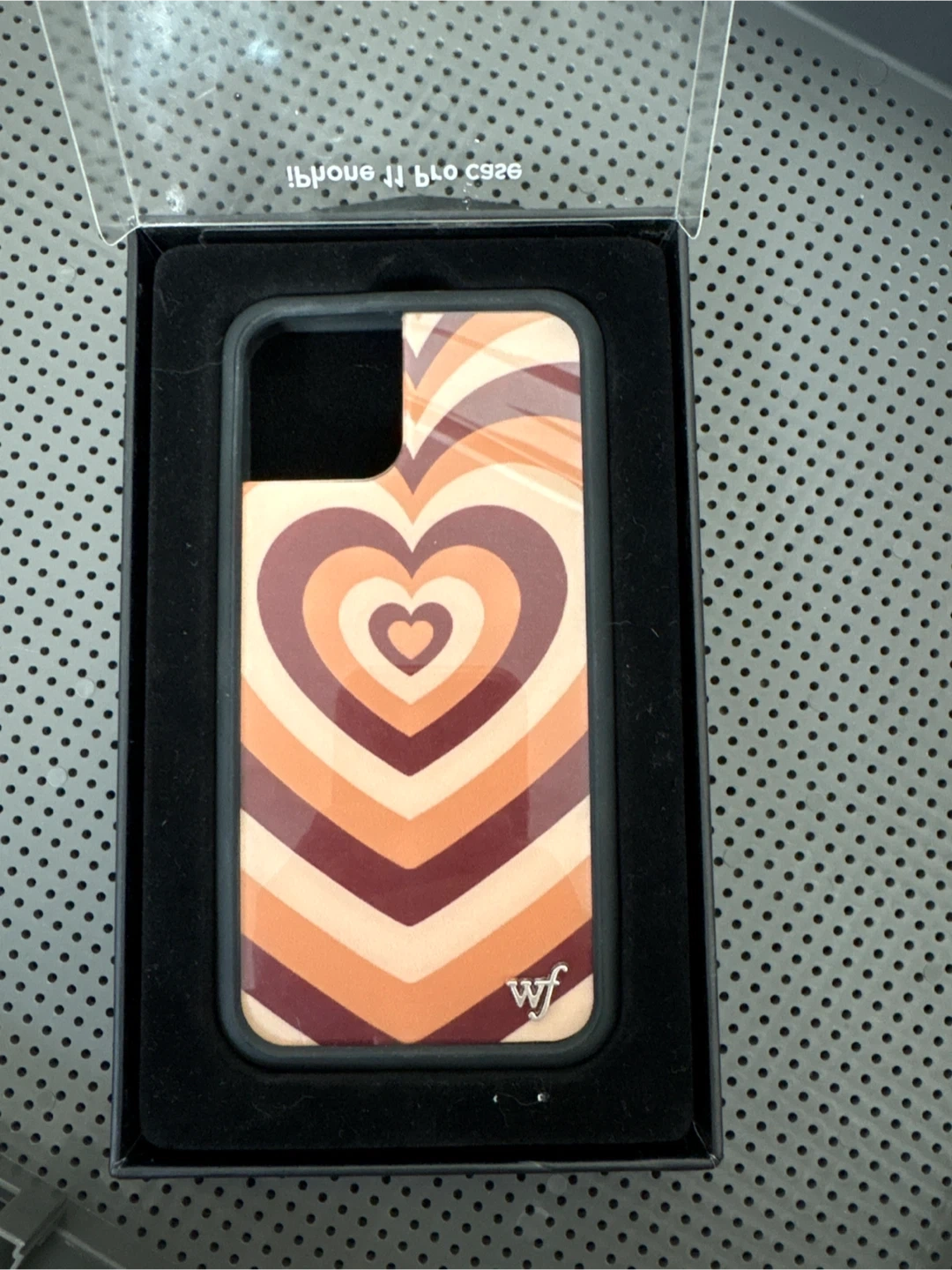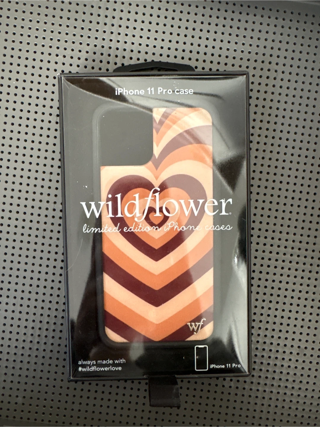 This is a limited edition Wildflower phone case designed for the iPhone 11 Pro. It features a unique heart pattern in warm, retro colours. The case comes in its original packaging.