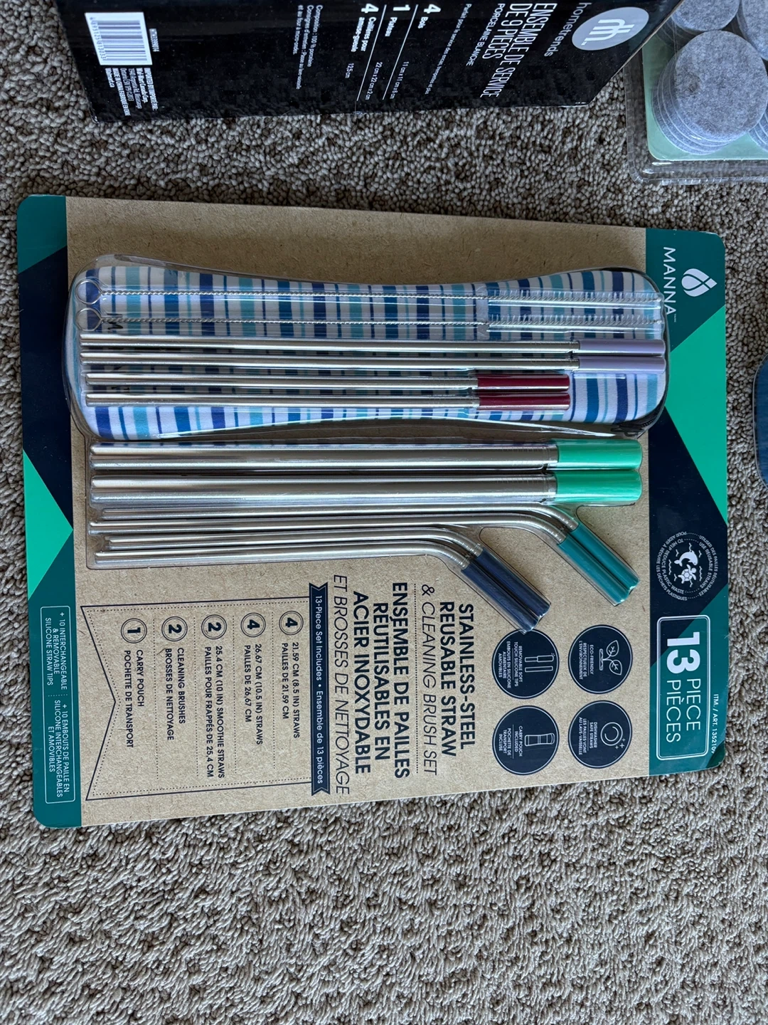 This MANNA set includes 13 pieces of stainless steel reusable straws and cleaning brushes. It comes with a carry pouch and different sizes of straws, including 21.5 cm, 26.5 cm, and 20.3 cm lengths. These straws are eco-friendly and perfect for everyday use!