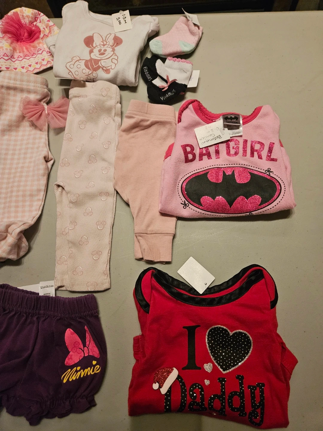 This lot includes a variety of baby girl clothing items featuring Disney's Minnie Mouse and DC Comics' Batgirl. It has onesies, pants, a romper, and socks, perfect for keeping a little one cozy and stylish. Many pieces are adorned with cute patterns and character graphics.