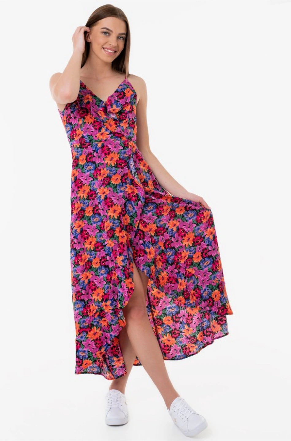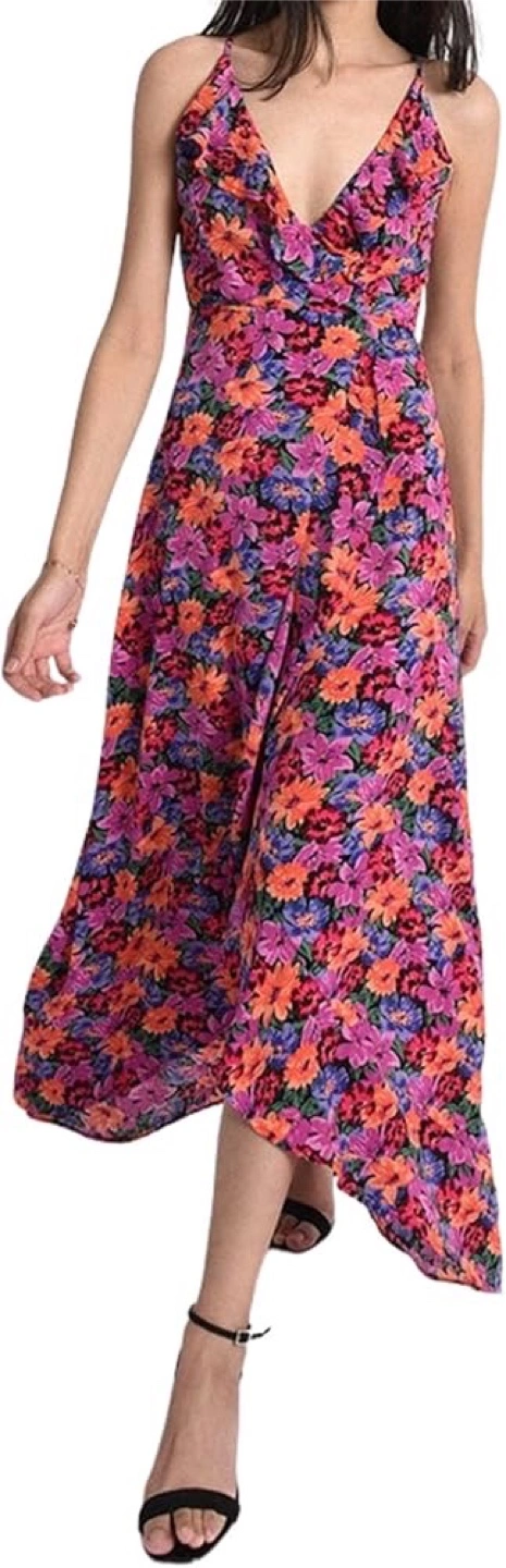 This is a beautiful floral print maxi dress, perfect for summer days or evenings out. It features a vibrant mix of colours and a flattering silhouette. It's in great condition and ready for a new home!