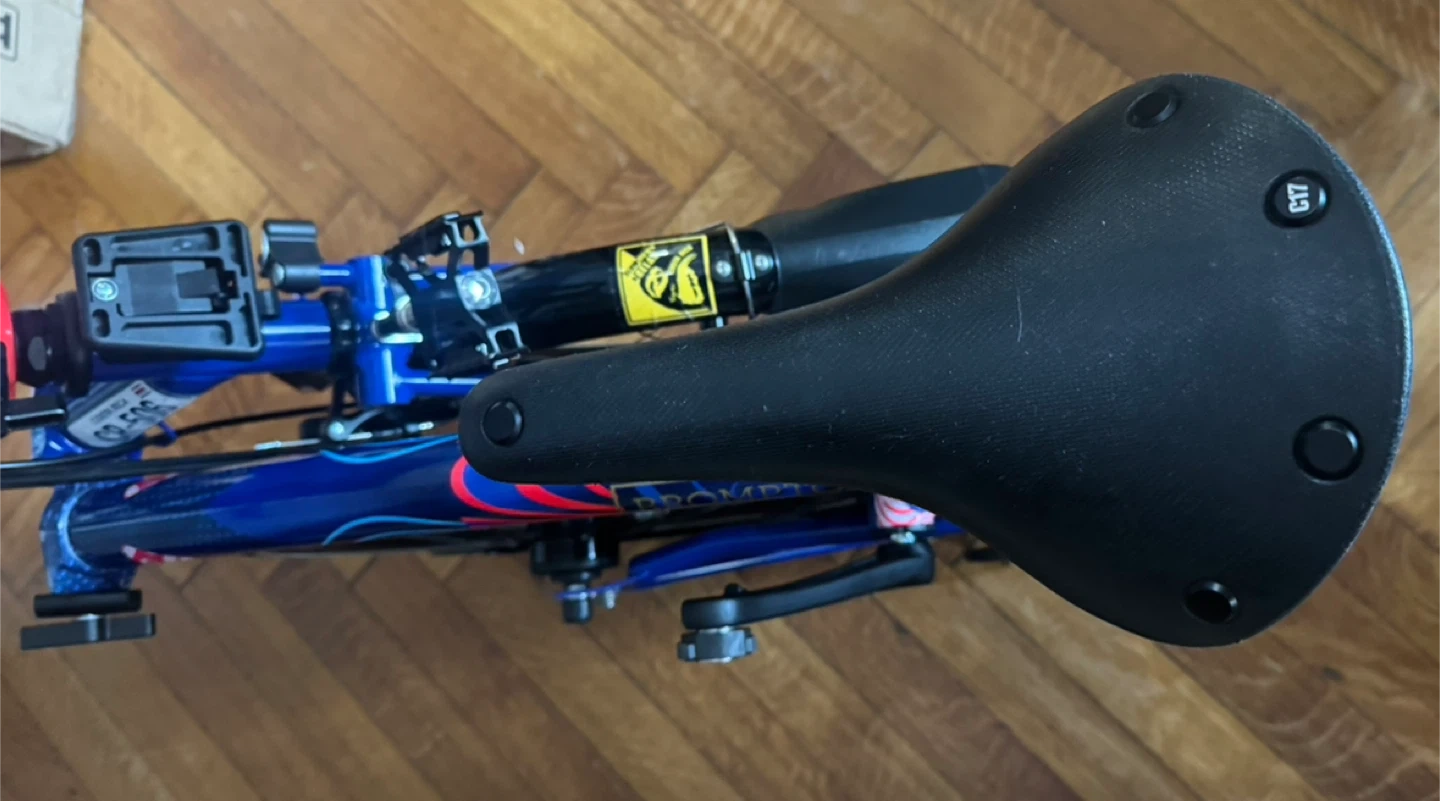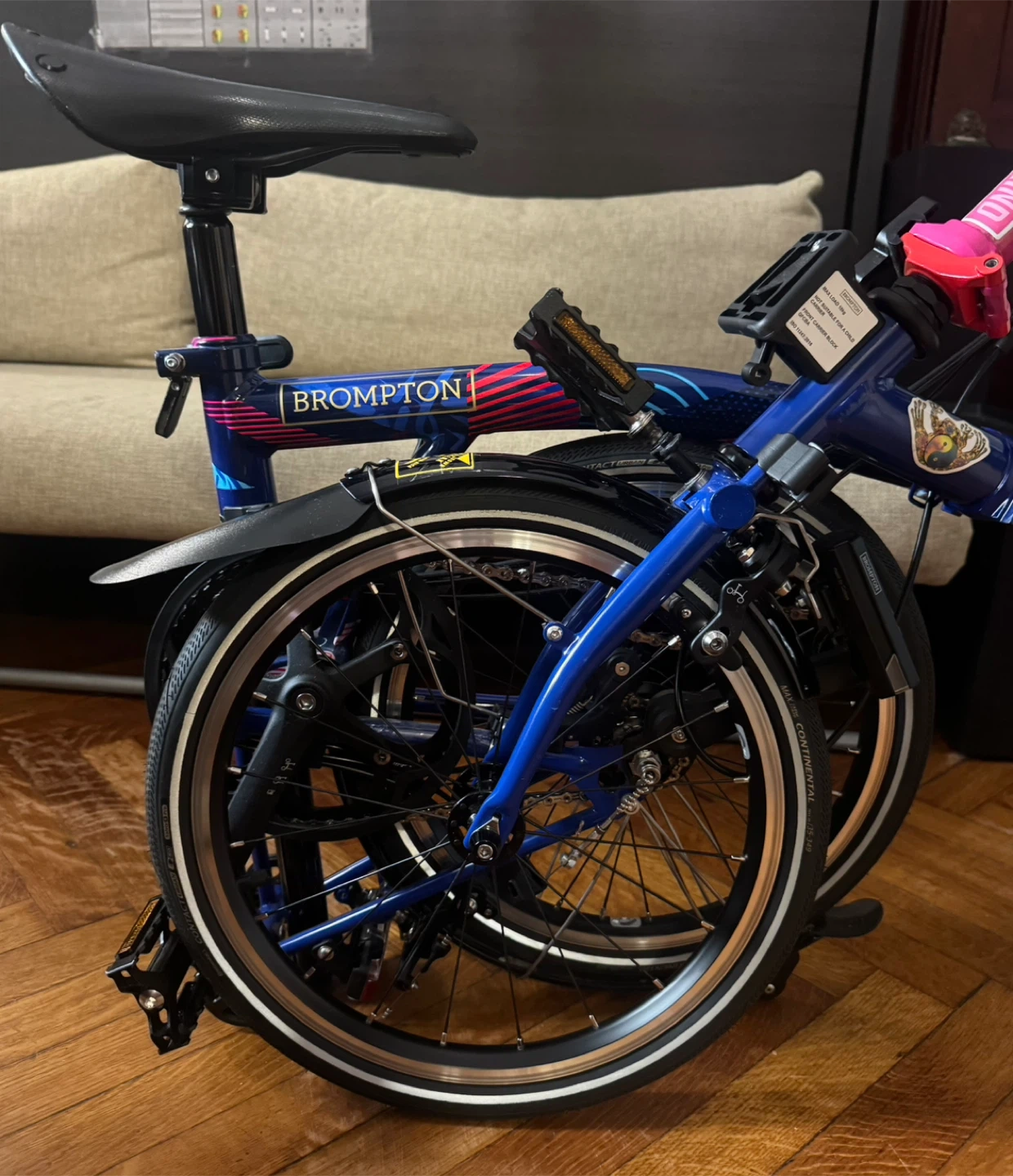 This is a Limited Special Olympic Edition Brompton Paris folding bicycle.