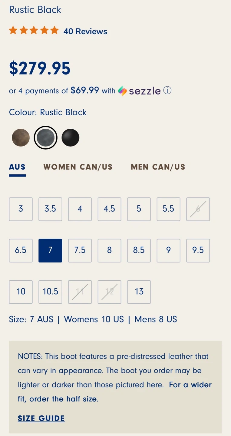 Included in the photos is a size guide as they are 7 AUS, but converts to 10 womens over here, as well as the style of the shoe.