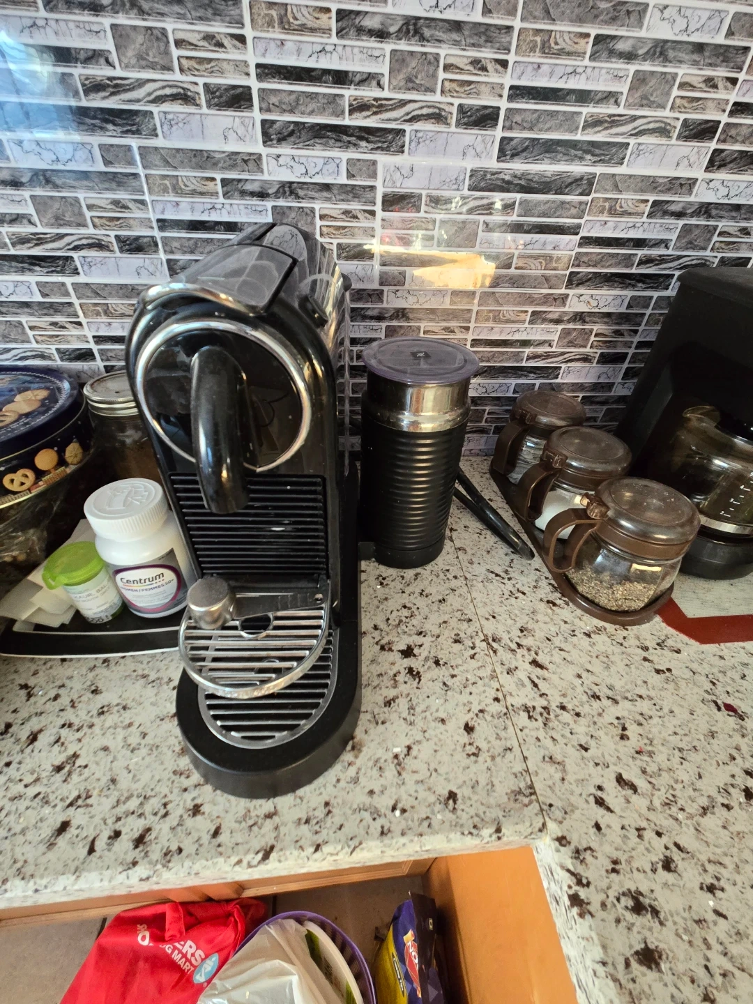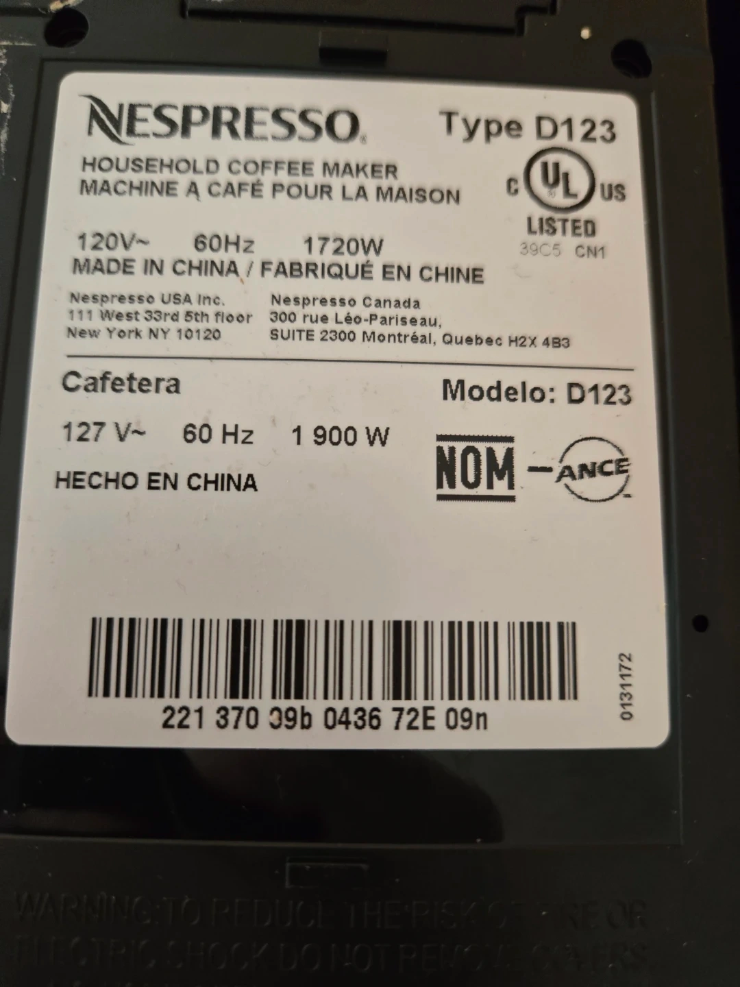 Nespresso D123 household coffee maker. 120V, 60Hz, 1720W. Made in China. Cafetera Modelo: D123. This coffee maker is great for a quick and easy brew!