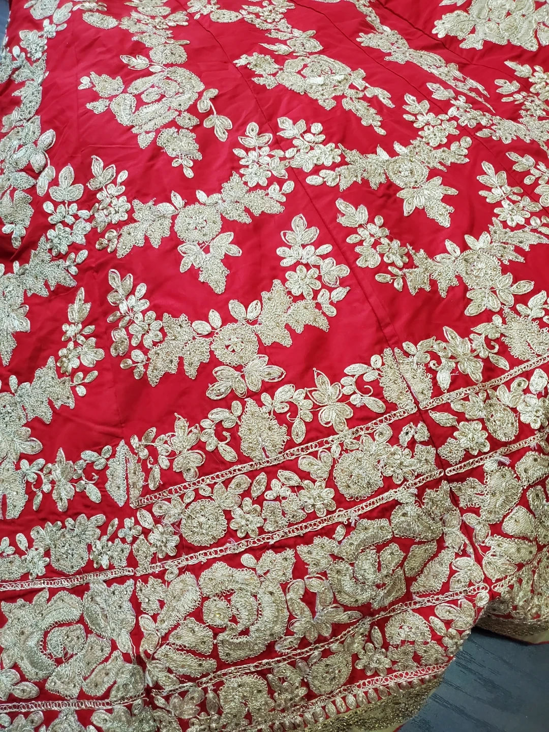 Beautiful red dress with gold embroidery! It's in great condition and would be perfect for a special occasion.