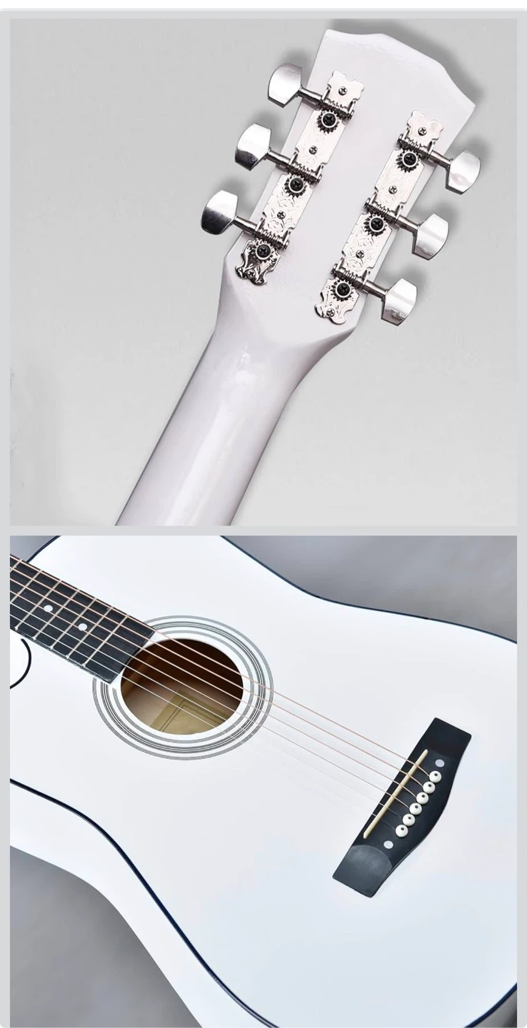 This is a Rosefinch 38-inch left-handed acoustic guitar bundle. It's a 3/4 size guitar with steel strings. The kit includes a gig bag, tuner, strap, capo, picks, and spare strings. Guitar dimensions are 96cm height, 36cm width, and 8.5cm thickness.(brand new)