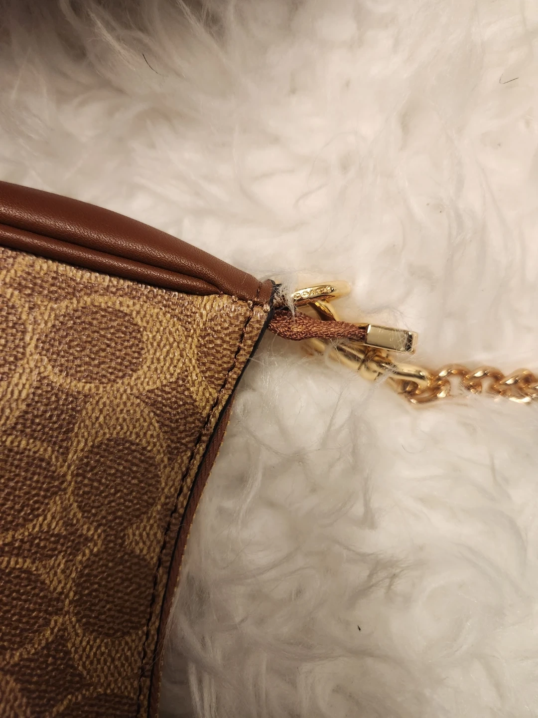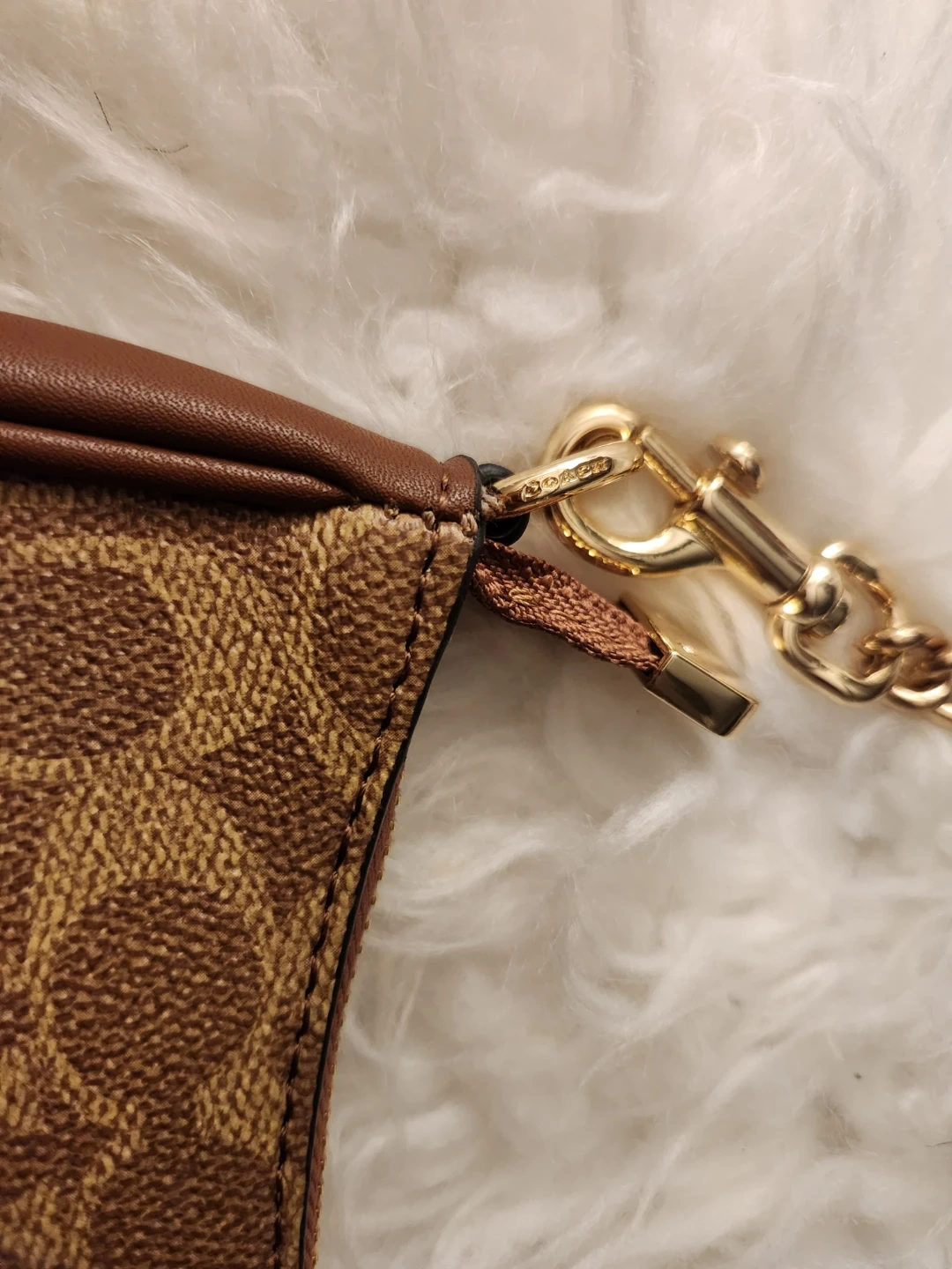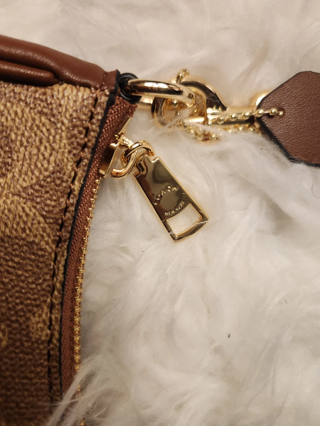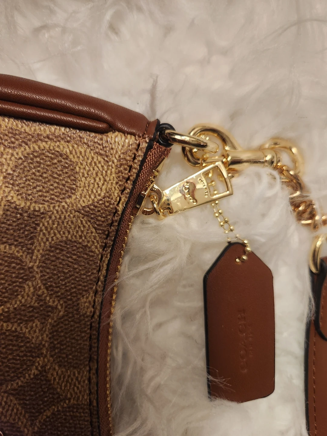 This Coach shoulder bag comes in their signature canvas with brown leather trim. It features a zip-top closure and an interior slip pocket. The bag has gold-tone hardware and a chain strap.