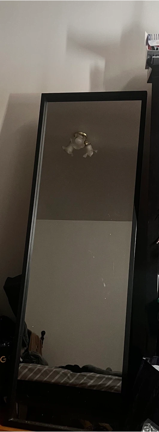 This is a full-length mirror with a black frame. It's perfect for checking your outfit before heading out. The mirror has a simple, modern design.