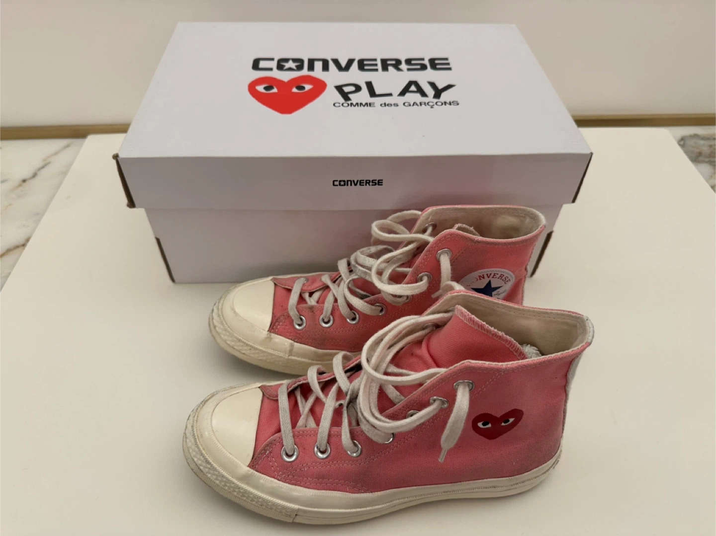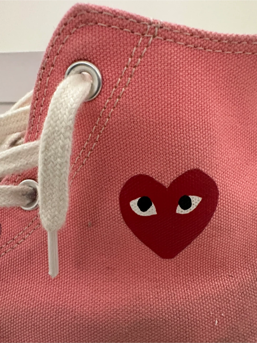 Selling a pair of Converse PLAY Comme des Garçons high-top sneakers in pink! They are a size 5 and come with the original box. The shoes have the iconic heart with eyes logo. They are in good condition and ready for a new owner!