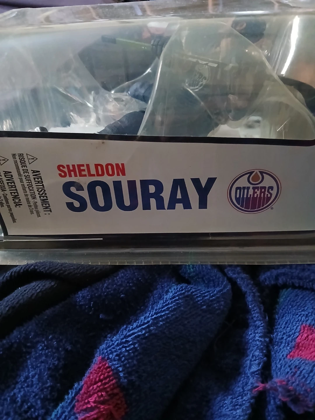 This is a Sheldon Souray action figure in his Edmonton Oilers uniform. It's packaged in a clear plastic display case.