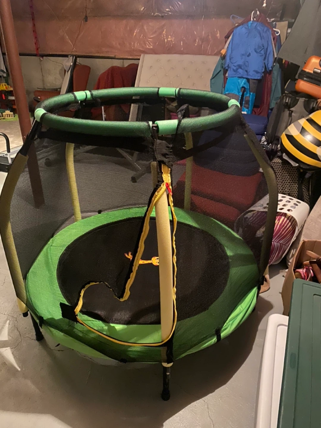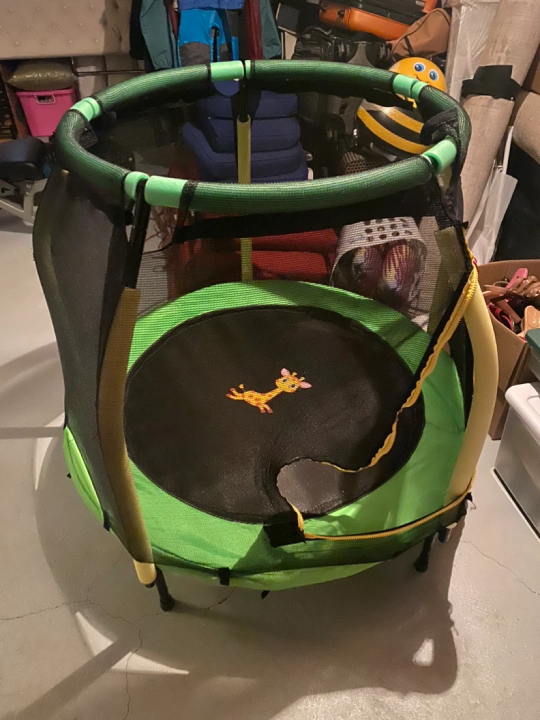 Small trampoline perfect for indoor or outdoor play. It features a safety enclosure net and a cute giraffe graphic on the mat. This trampoline is great for toddlers and young children to burn off energy safely. It's suitable for kids who are learning to bounce and develop coordination.
