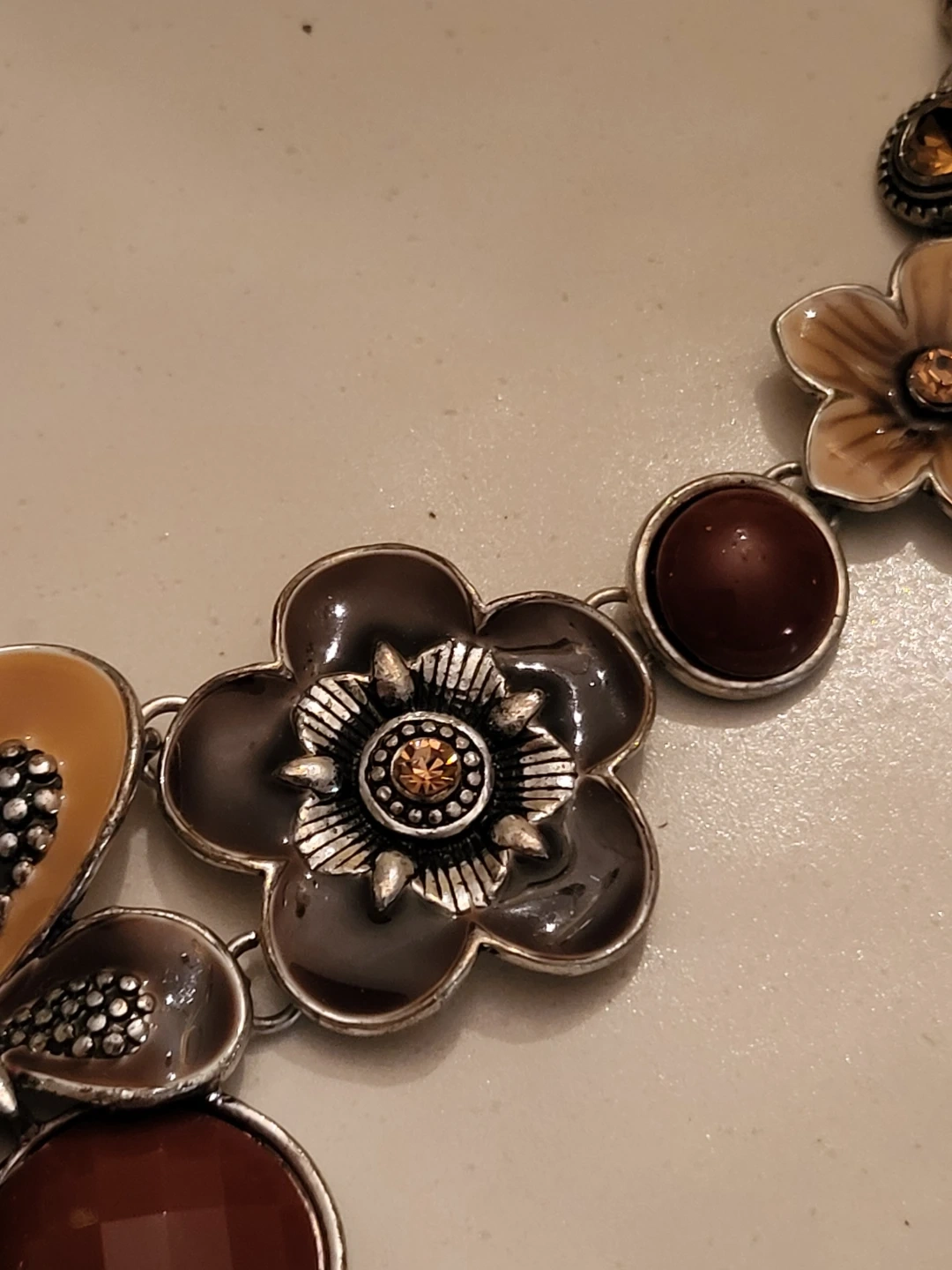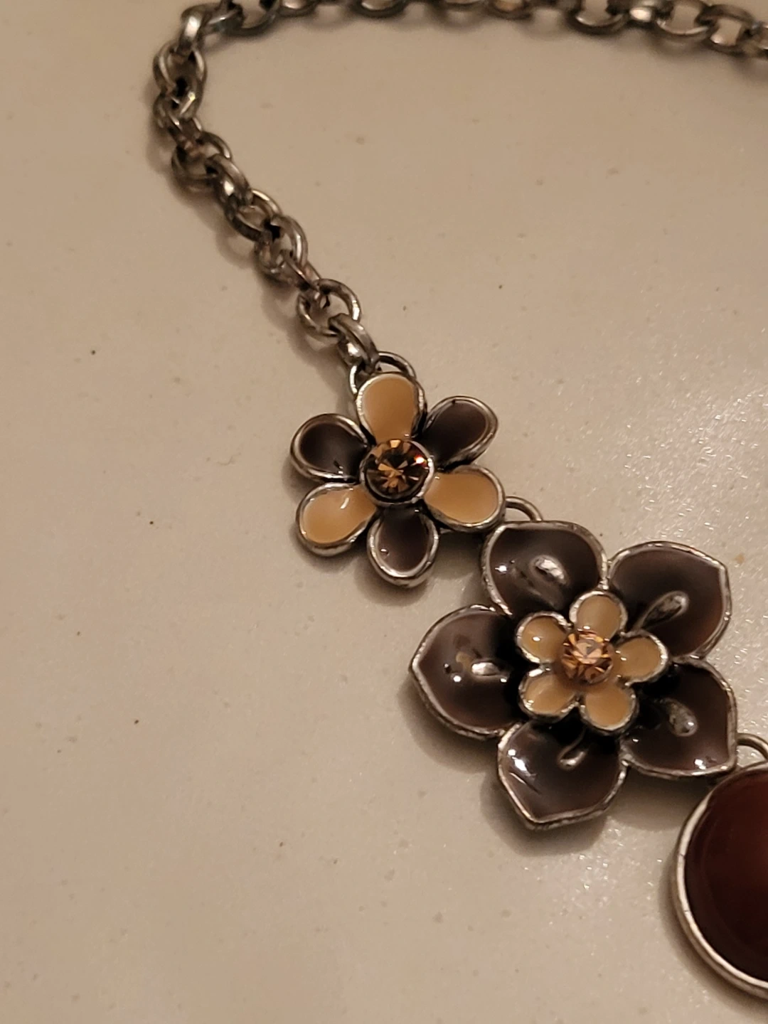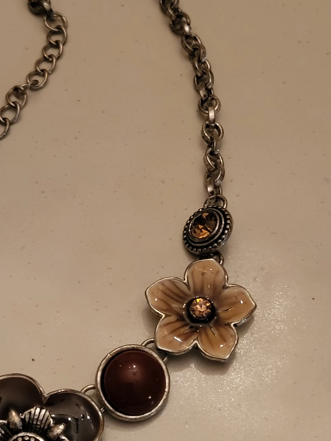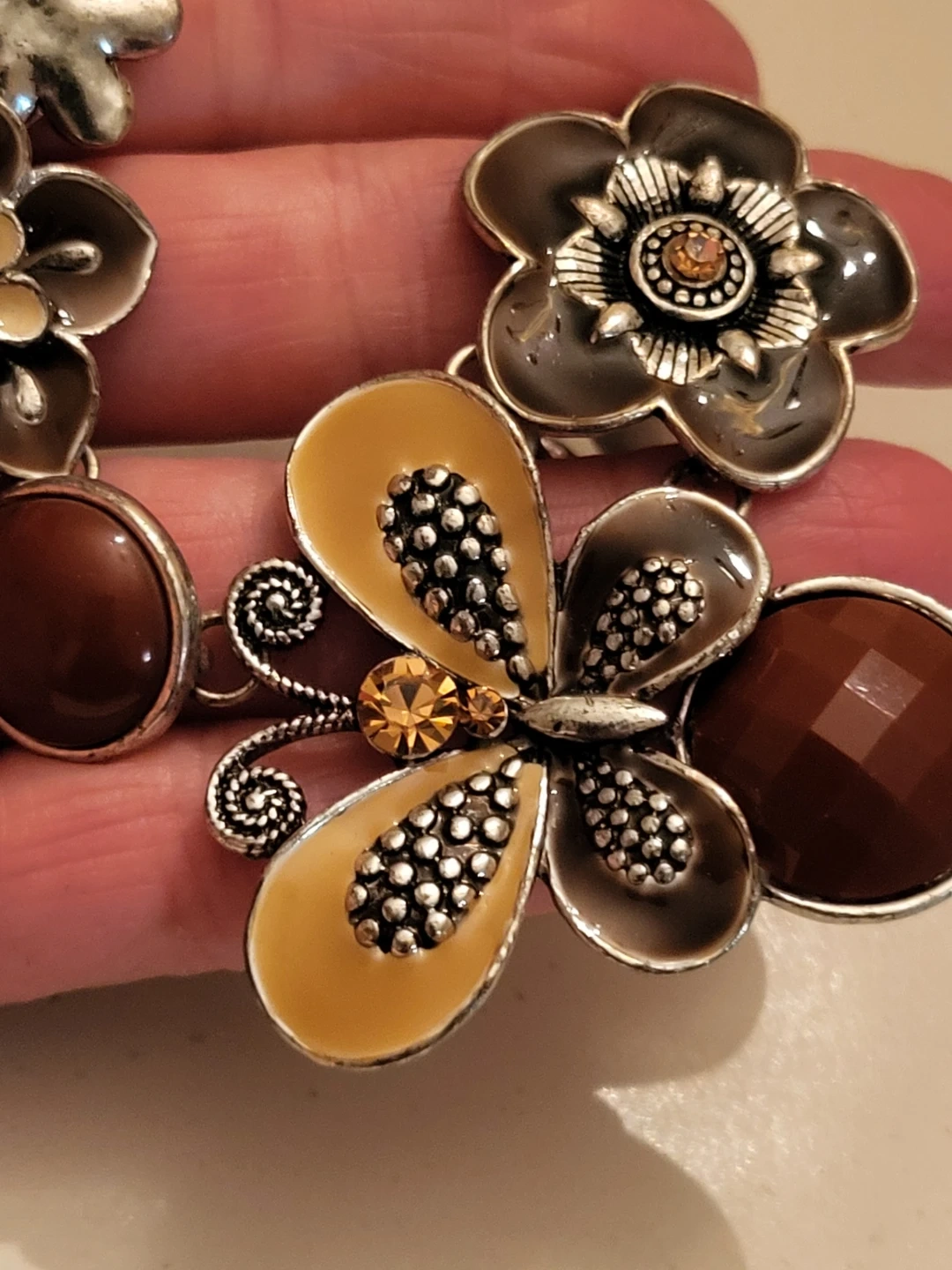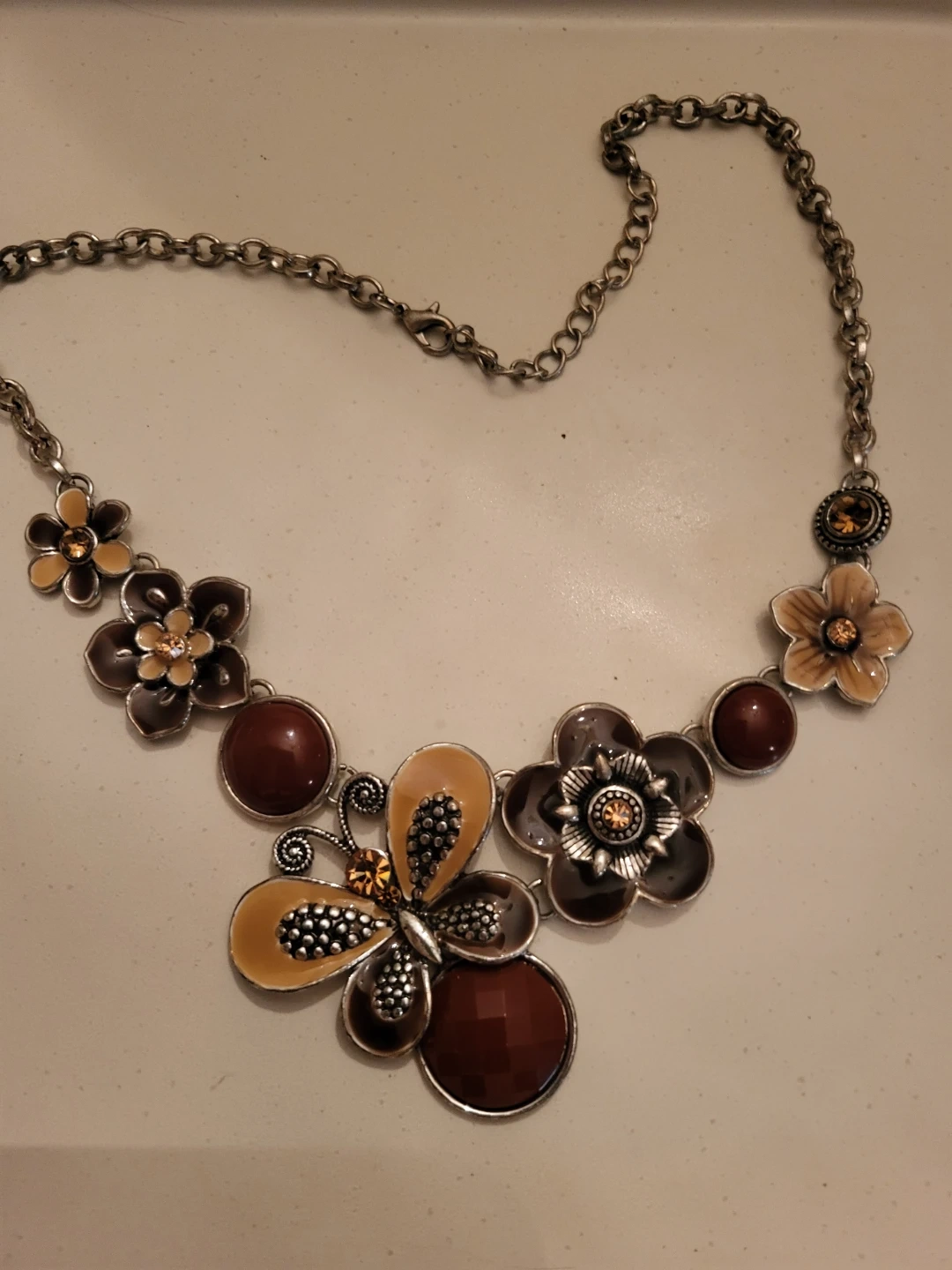 Pretty vintage necklace with a floral and butterfly design. It features brown and tan enamel flowers, maroon beads, and a butterfly with amber-coloured gems. Silver-tone chain.
