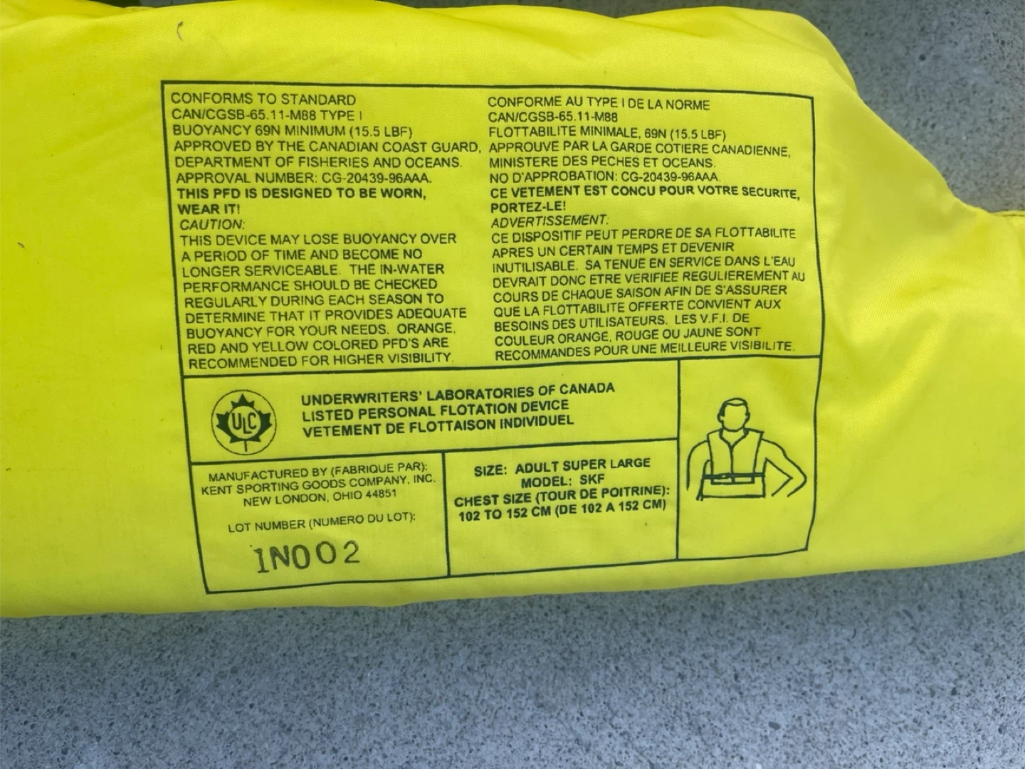 This is an adult super large SKF personal flotation device life vest. Approved by the Canadian Coast Guard, it offers 69N minimum buoyancy. Chest size fits 102 to 152 cm (40 to 60 inches). It's designed for water wear and safety!