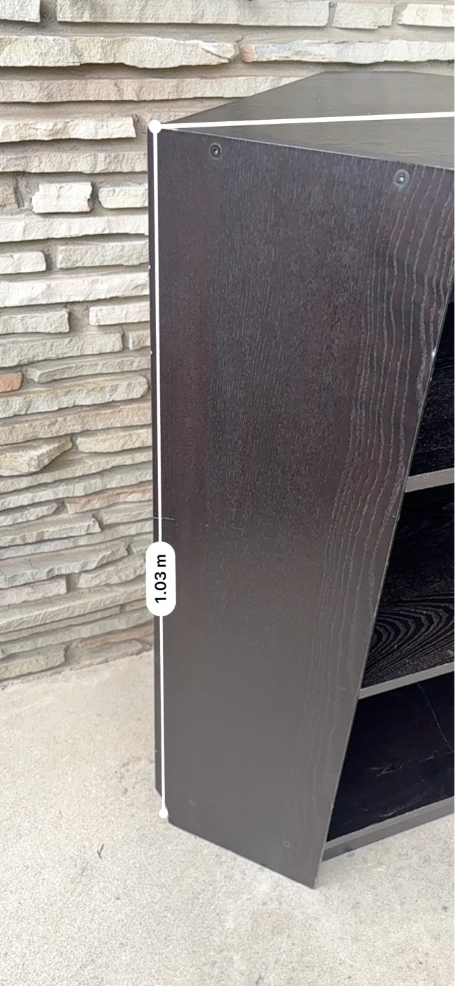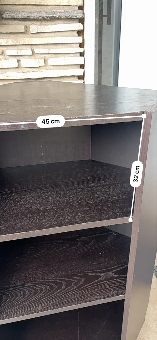 Dark brown corner shelving unit with three shelves. Measures 45 cm wide and 103 cm high. Shelf depth is 32 cm. It's perfect for organizing items in a corner space.