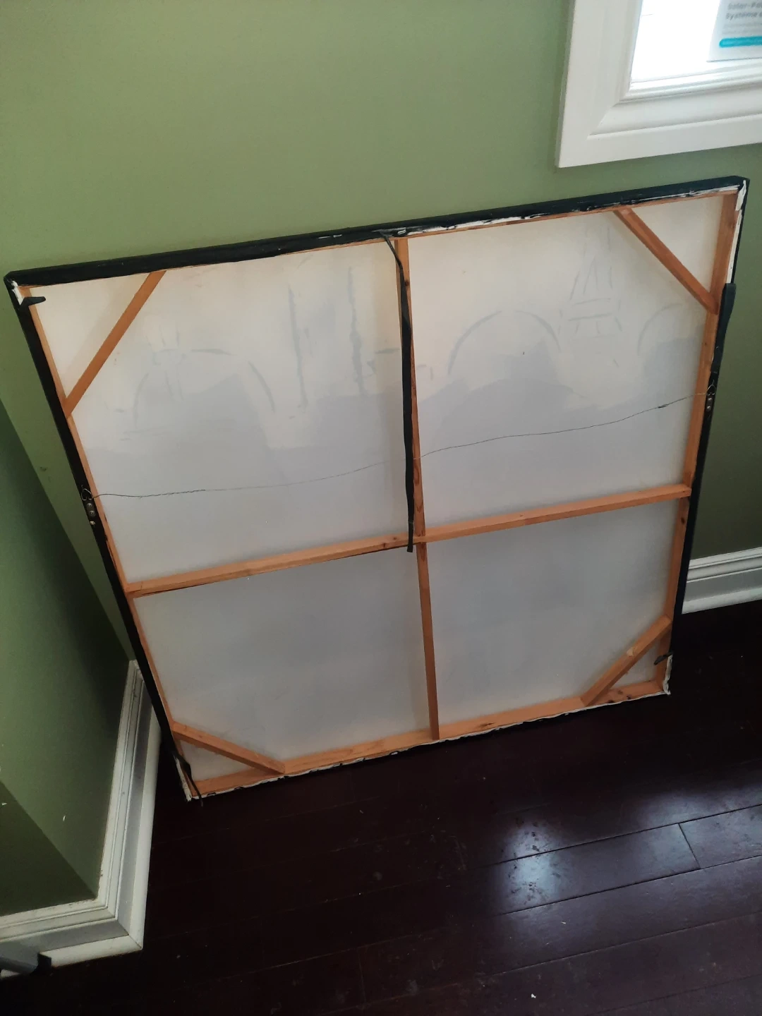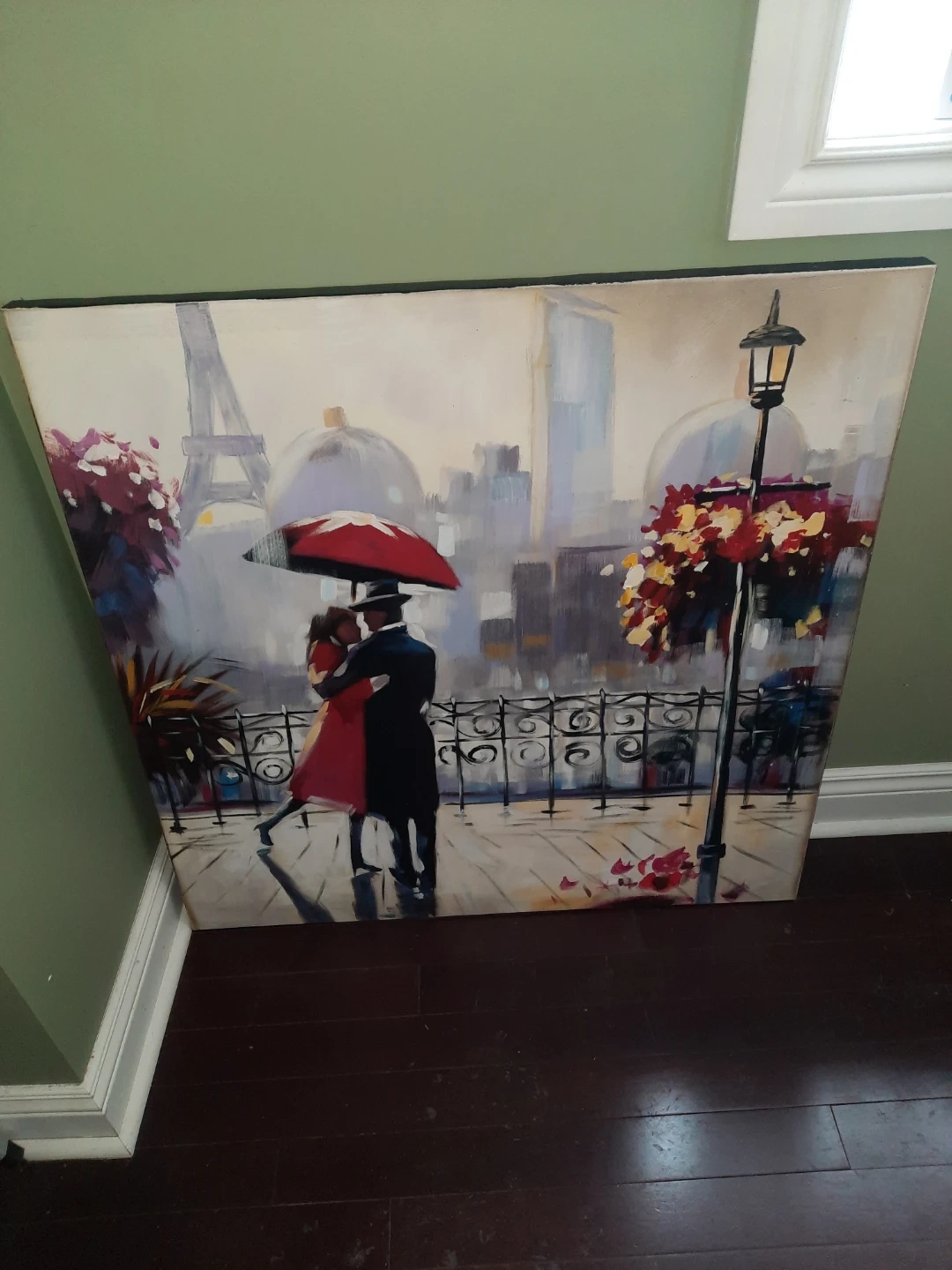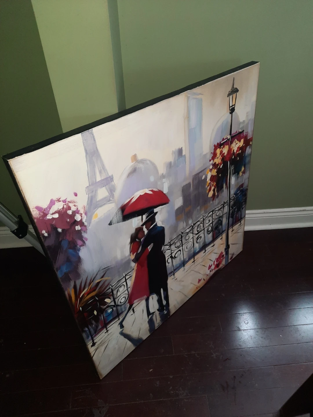 A lovely canvas painting depicting a couple sharing an umbrella with the Eiffel Tower in the background. It's framed and ready to hang. Adds a touch of romance to any room!