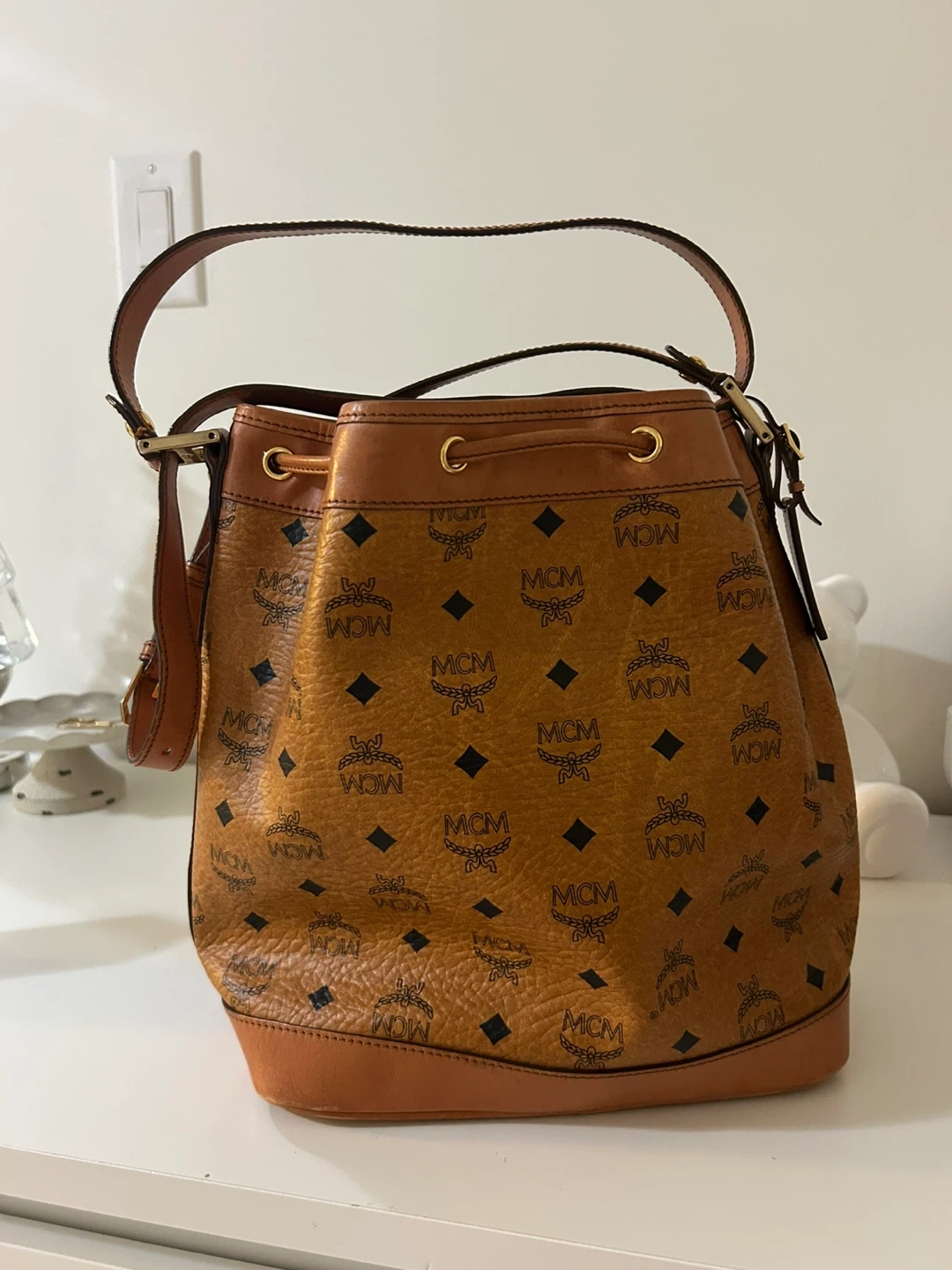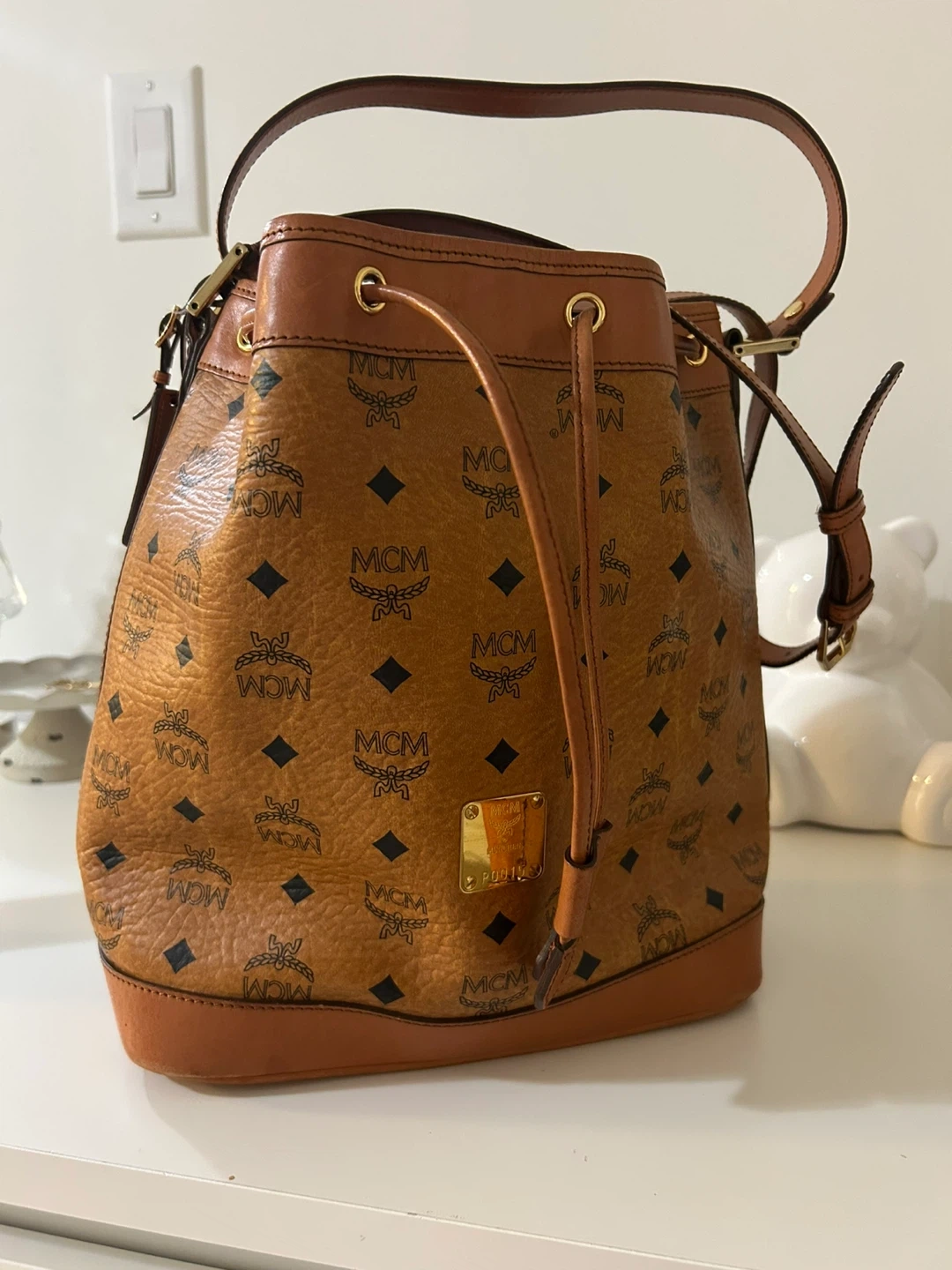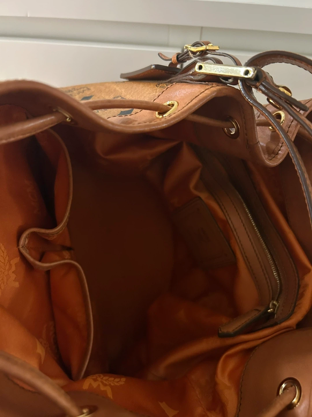 Classic MCM bucket bag in a rich cognac colour. It features the iconic MCM all-over print and gold-tone hardware. Leather material with a satin lining. This bag has a drawstring closure and an adjustable shoulder strap.