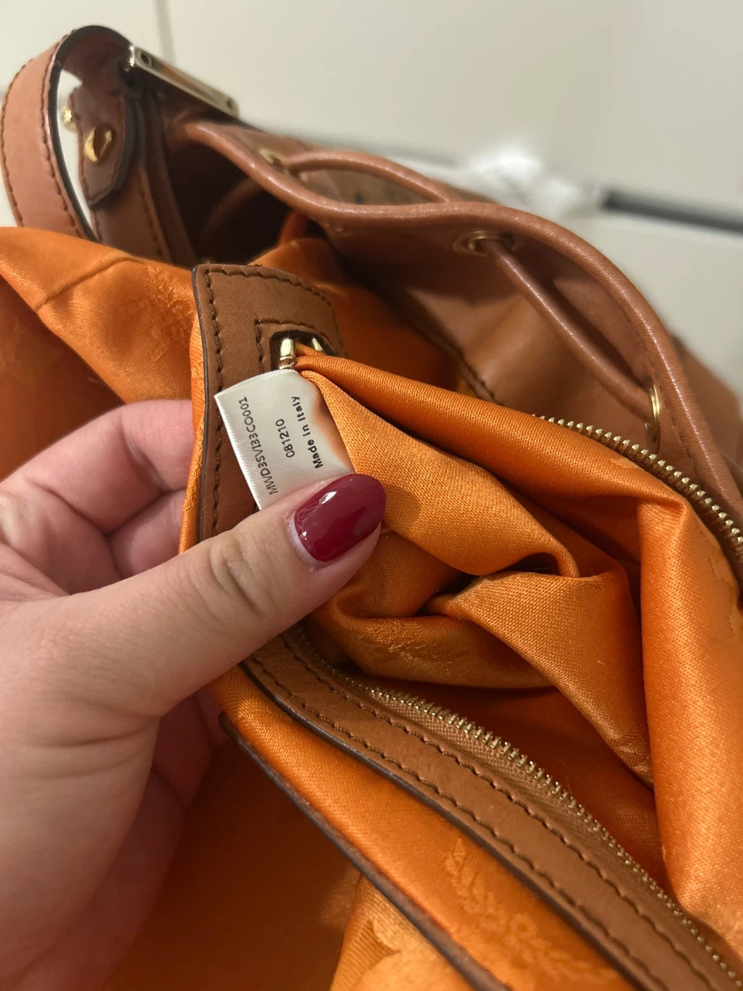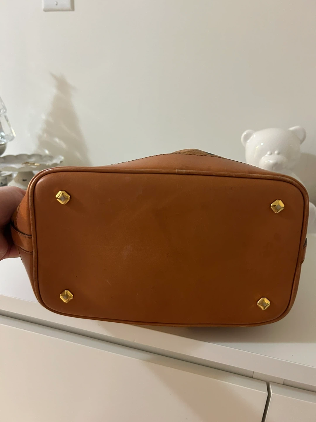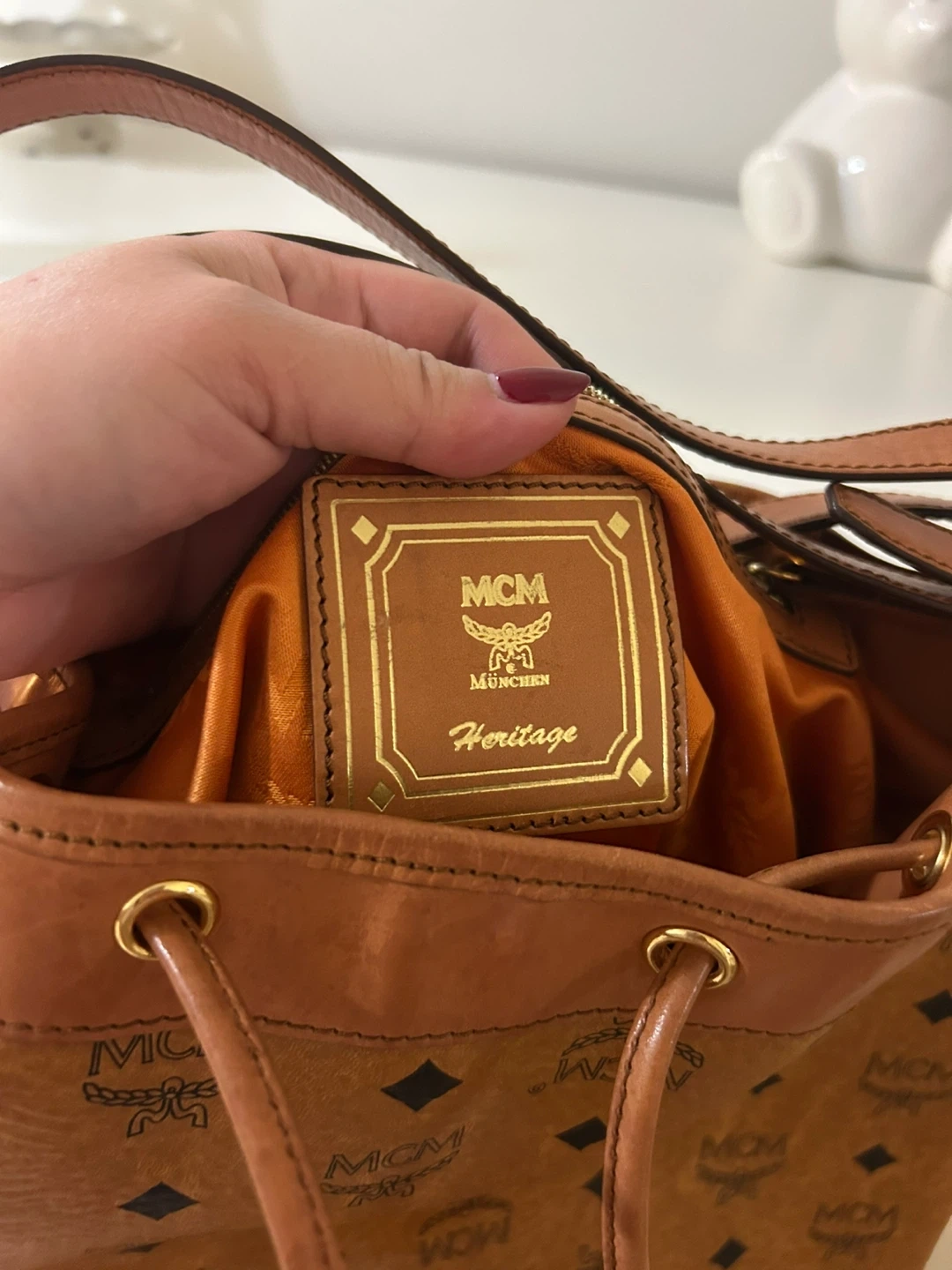 Classic MCM bucket bag in a rich cognac colour. It features the iconic MCM all-over print and gold-tone hardware. Leather material with a satin lining. This bag has a drawstring closure and an adjustable shoulder strap.