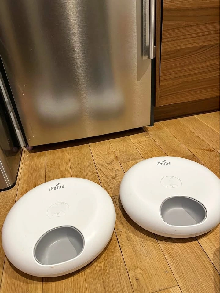 Automatic cat feeder for wet or dry food. Includes ice packs, charger, and feeder.
