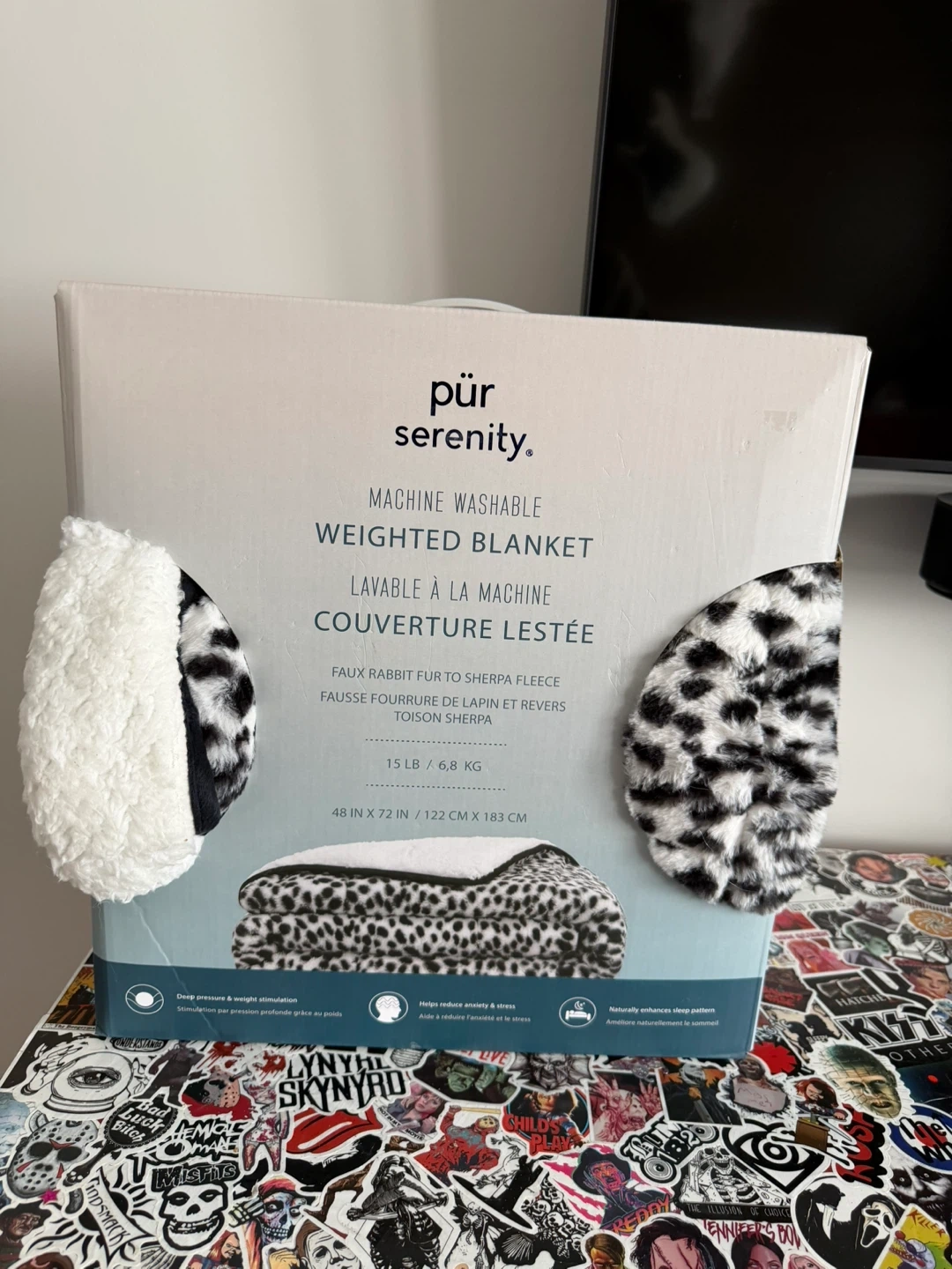 This Pür Serenity weighted blanket is machine washable and made with faux rabbit fur to sherpa fleece. It measures 48 in x 72 in and weighs 15 lb. It's designed to help reduce anxiety and stress. It's great for improving sleep patterns!