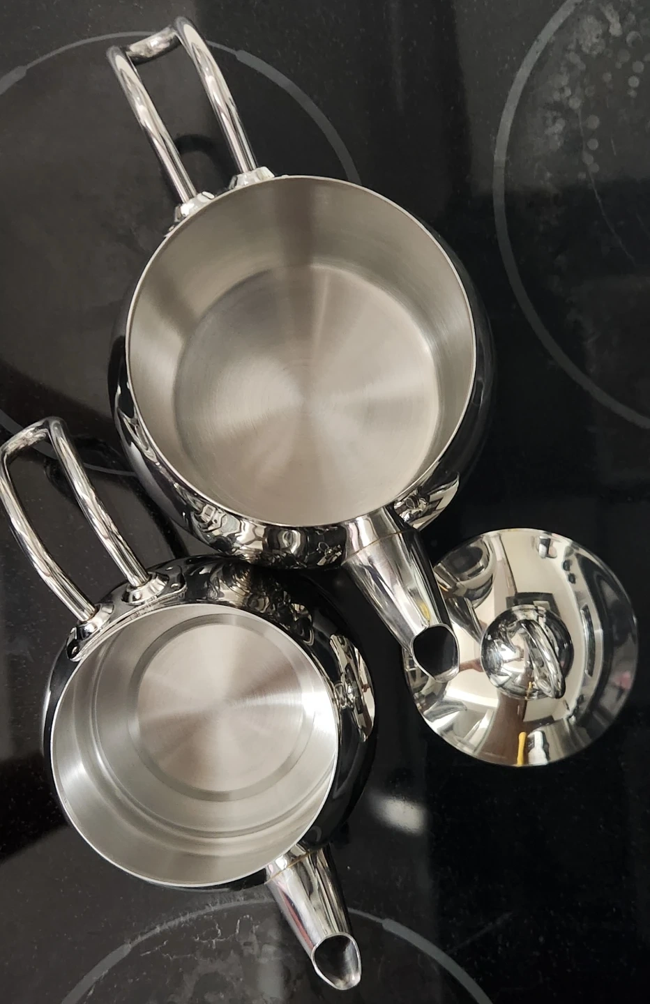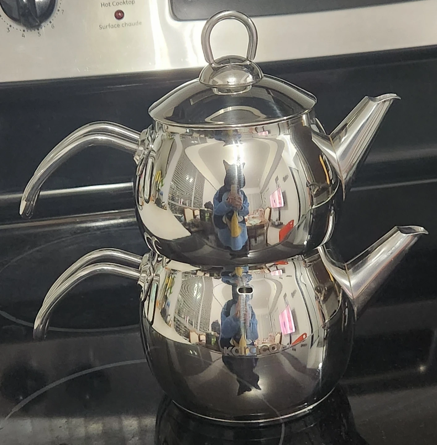 This is a two-piece stainless steel Turkish tea pot set. It's shiny and includes a lid. It's perfect for brewing and serving authentic Turkish tea!
