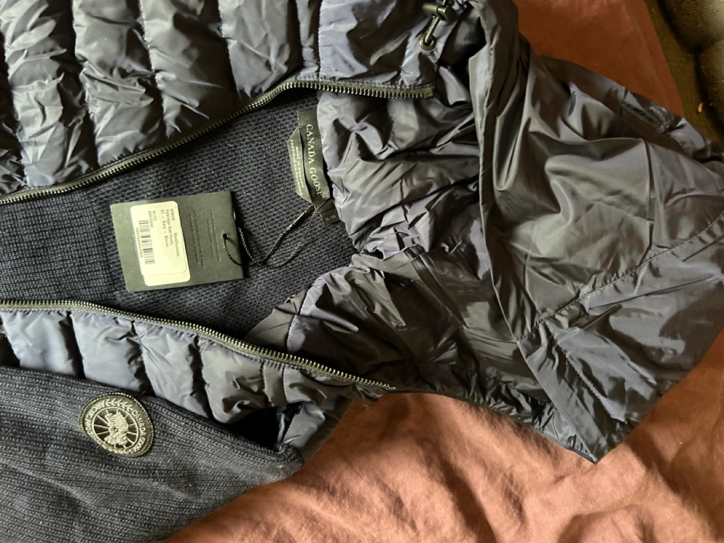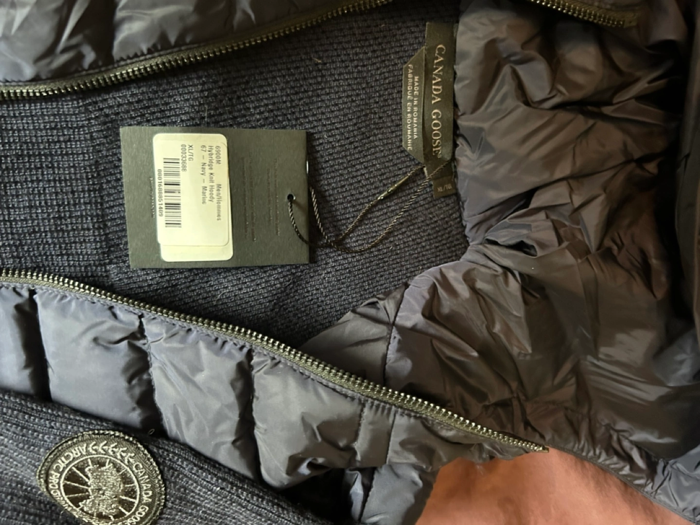 Men's navy blue Hybridge Knit jacket. Features a quilted down-filled section and a ribbed knit sweater design. Includes a hood. Excellent condition. Never worn, tags on.