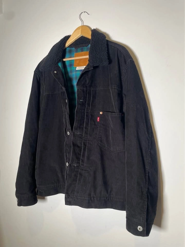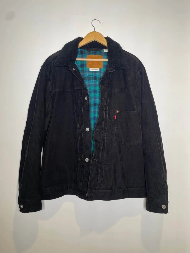 Selling a Levi’s Premium Sherpa-Lined Trucker Jacket in black corduroy. This is from the higher-end Premium line, featuring the iconic "Big E" red tab—a detail highly sought after for its superior construction compared to standard retail versions.