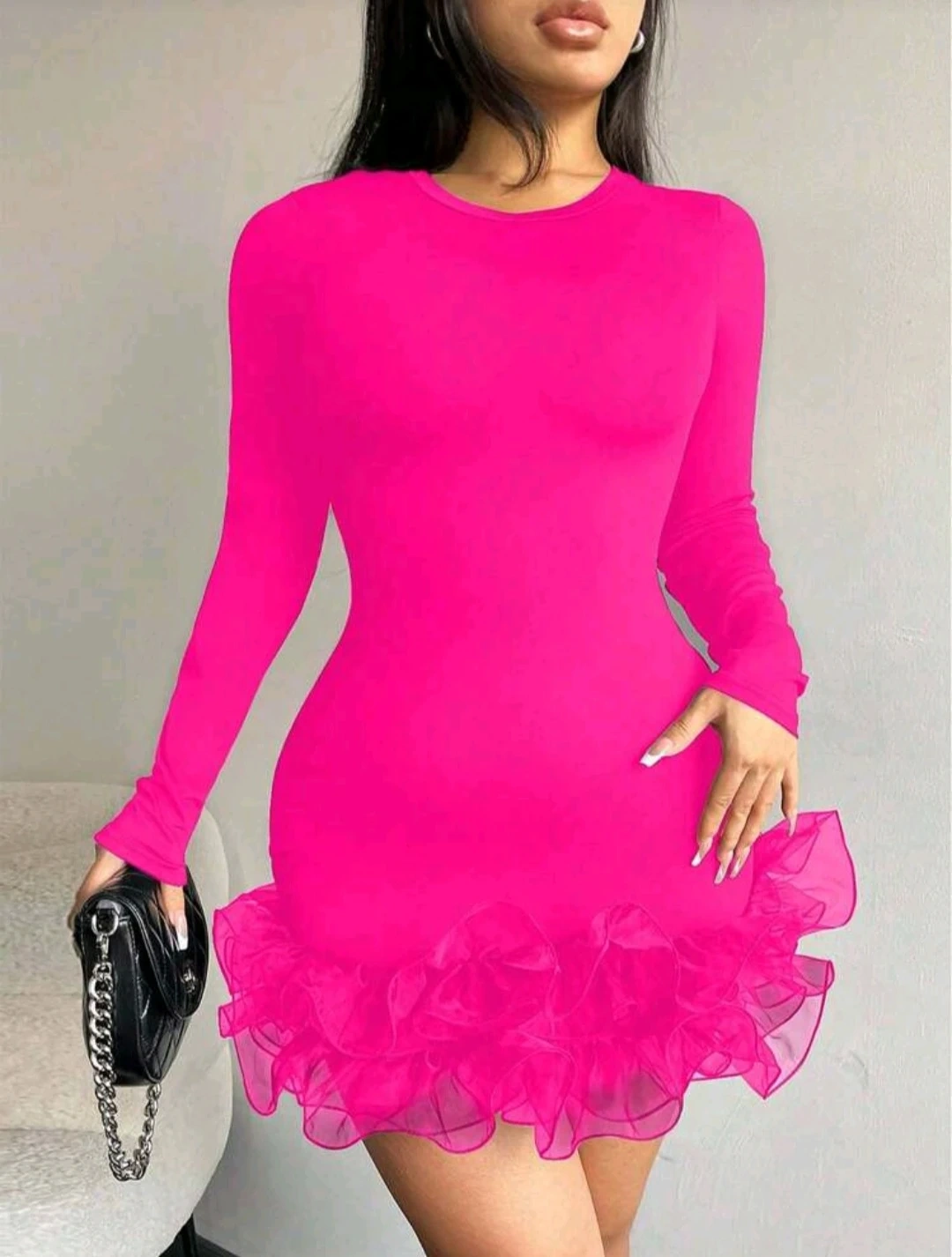 This hot pink mini dress features long sleeves and a flattering fitted silhouette. It's designed with a playful ruffle hem for added flair. Crafted from a comfortable, stretchy material.