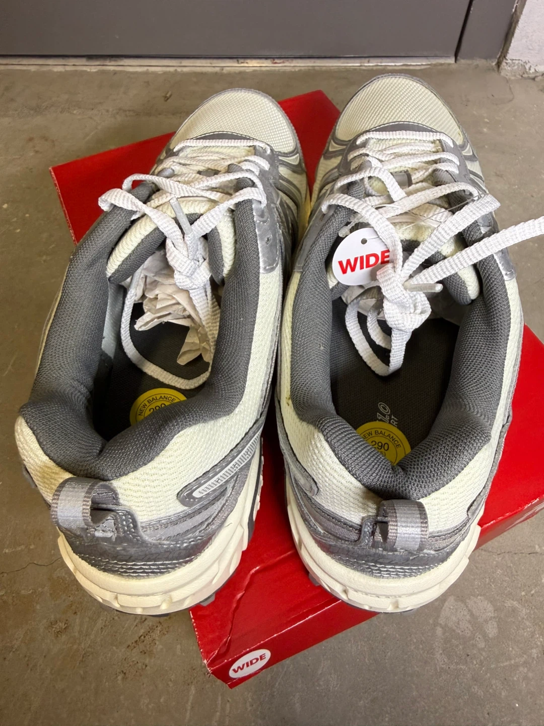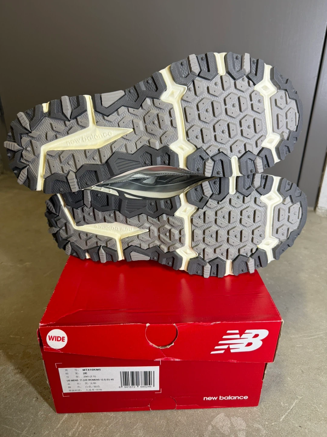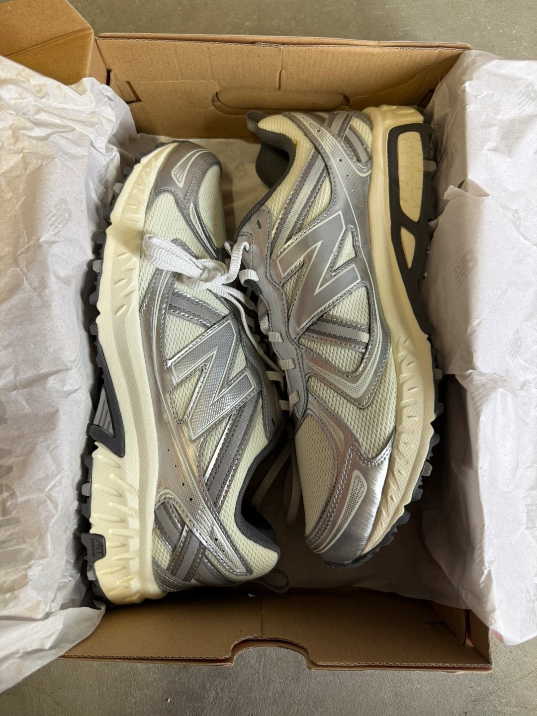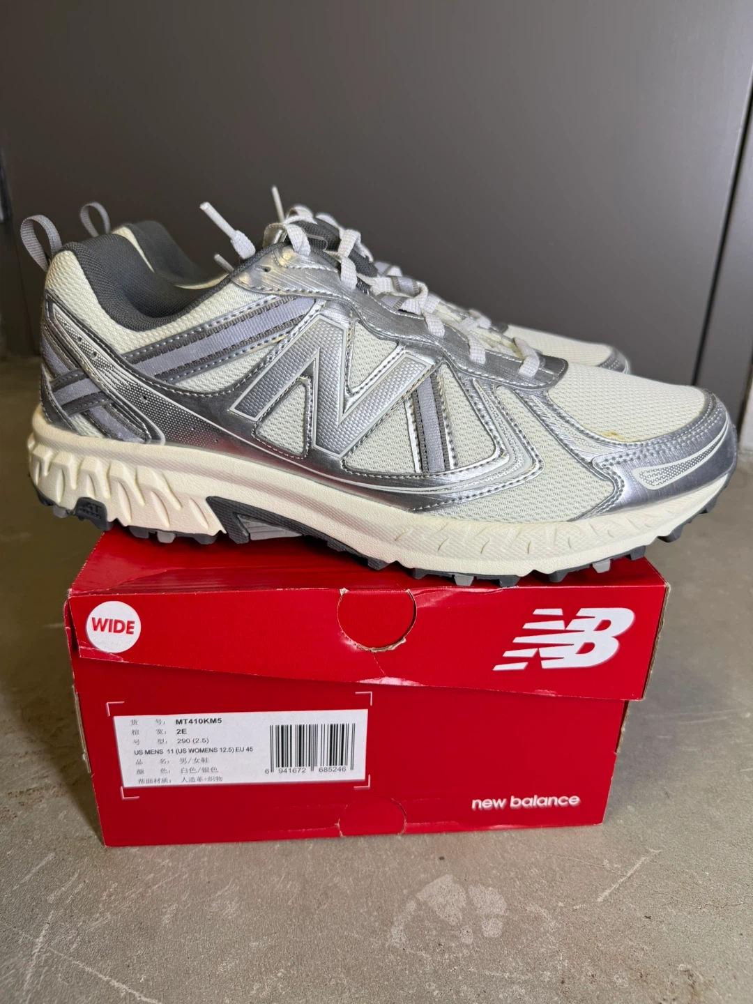 New Balance MT410KM5 trail running shoes in a wide width. These shoes are women's size 11. They are a light beige and silver colour. Includes original box.
