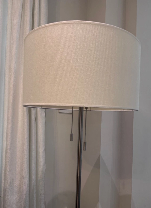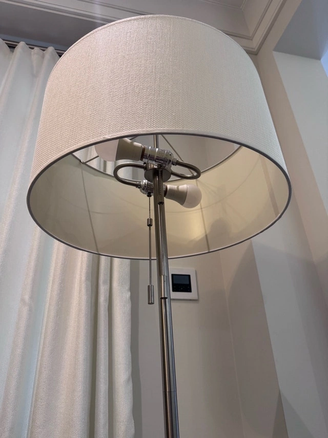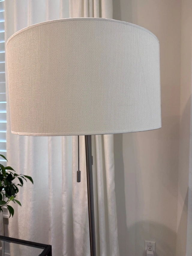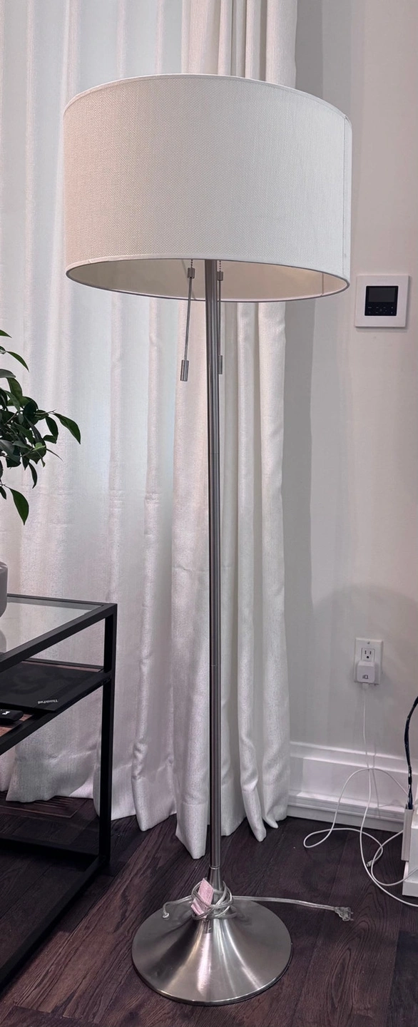 Brighten up your space with this elegant floor lamp! It features a sleek, silver finish and a large, white drum shade that provides a warm and inviting glow. This used lamp is in excellent condition and ready to illuminate your home. Details: Style: Modern, Finish: Silver, Shade: White drum, Dimensions: 5 feet tall. Selling for $100 each, or a discount if you take all three. If you're seeing this ad, the lamps are still available.