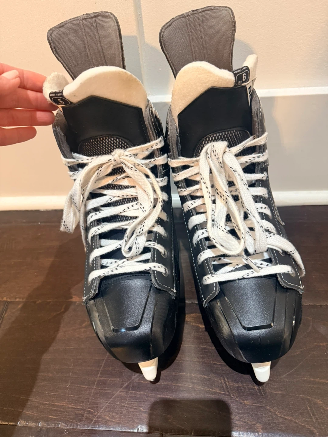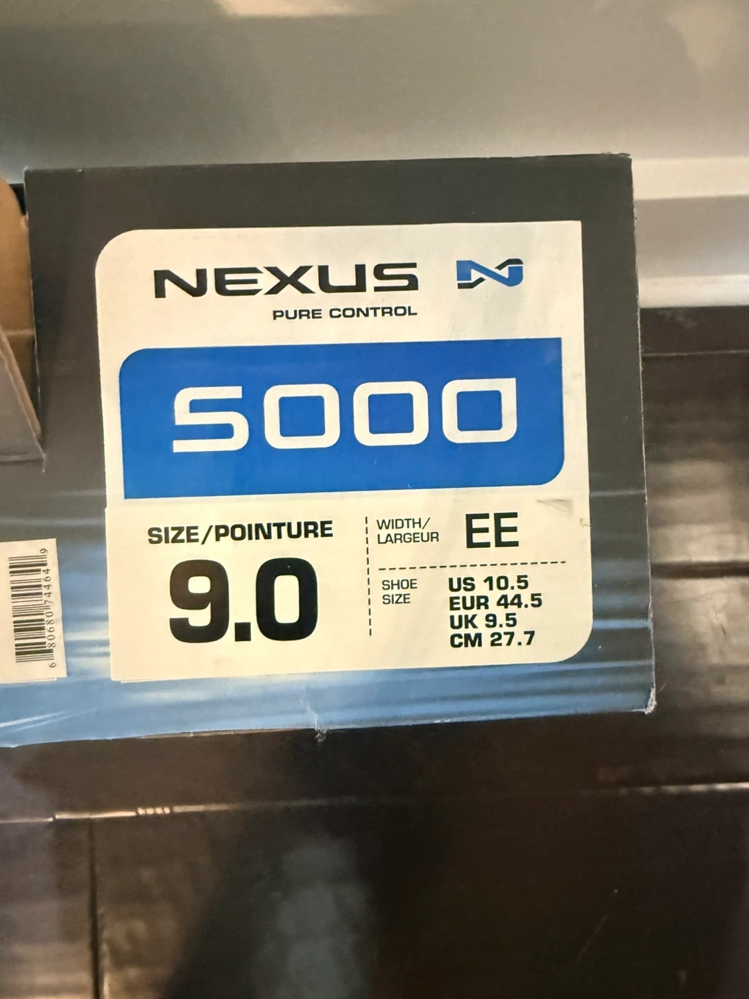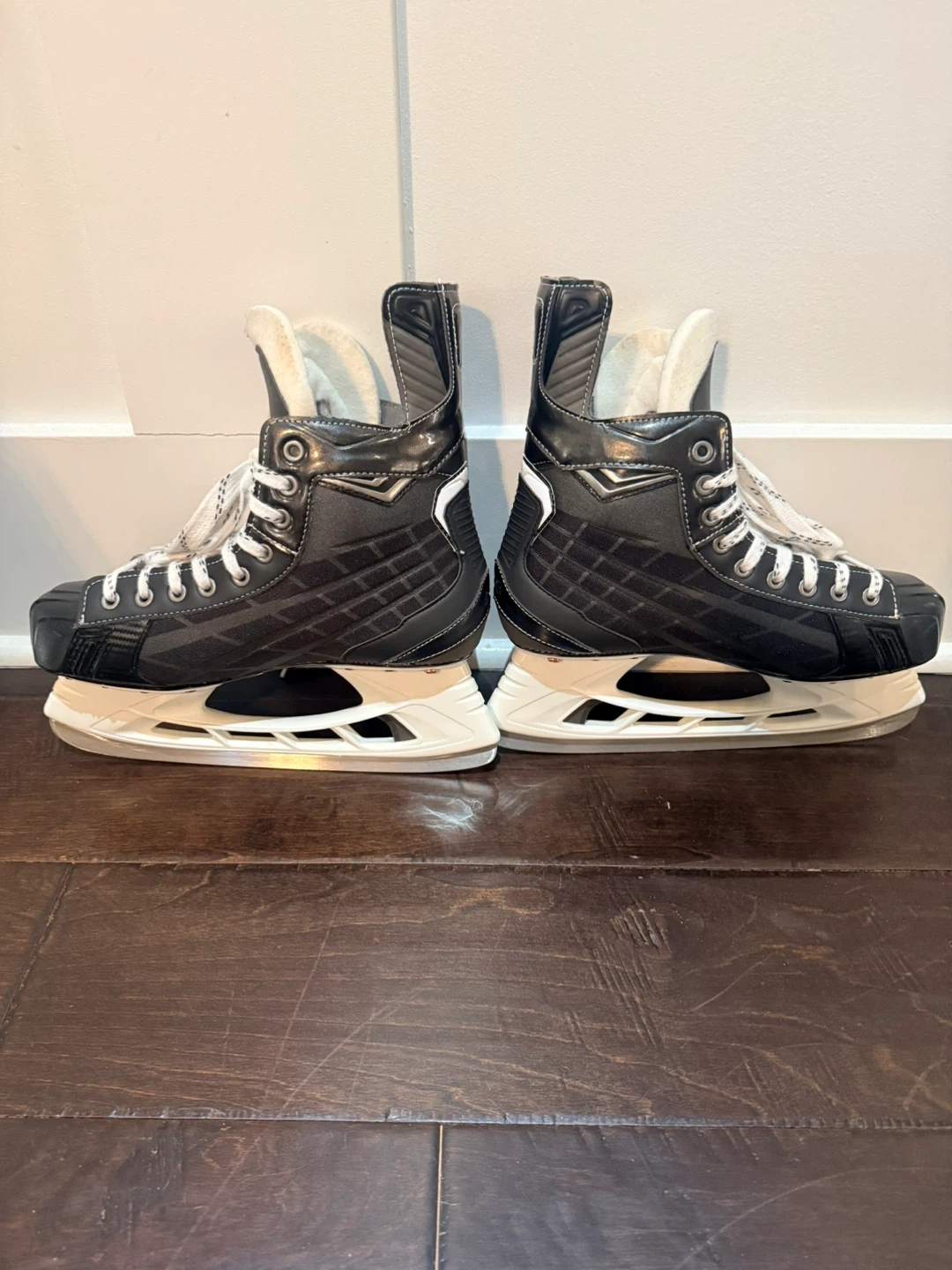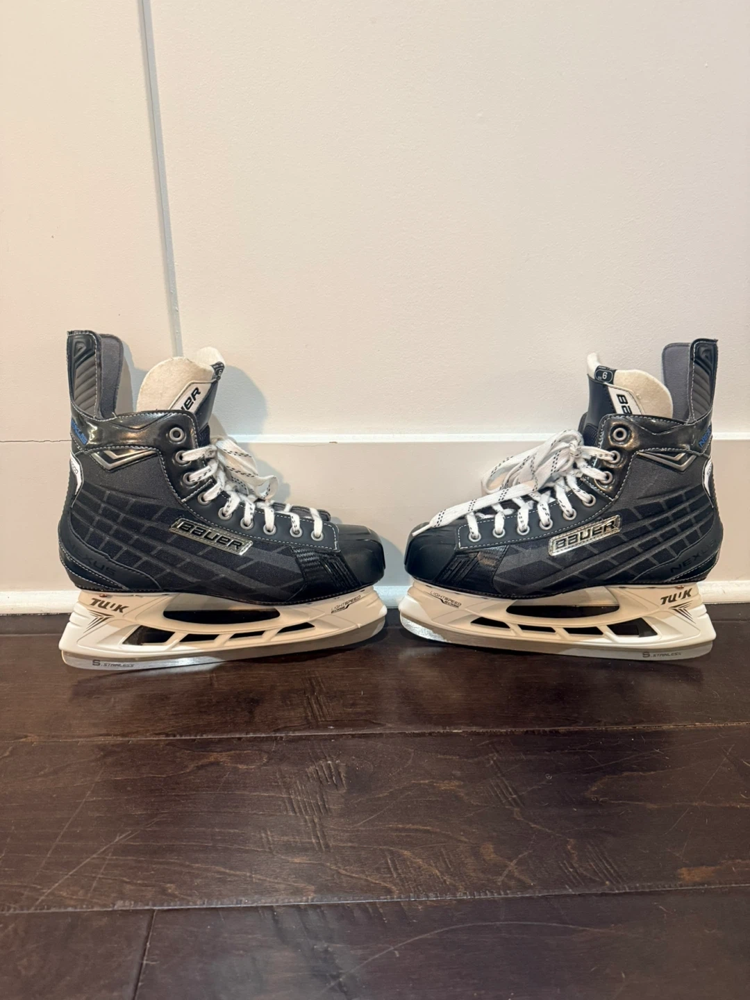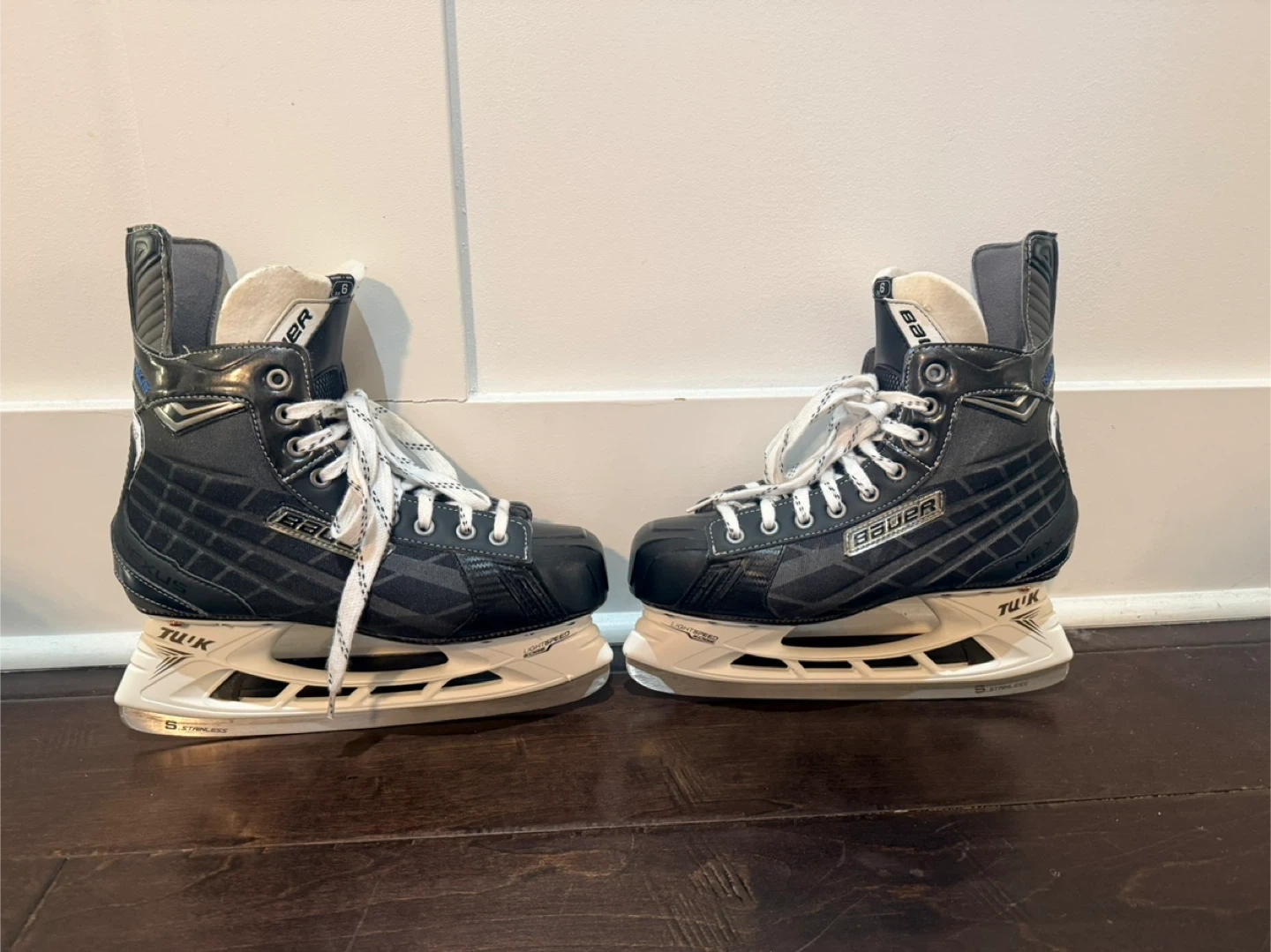 New Bauer hockey skates. These skates feature TUUK holders and stainless steel blades. Size 9 US 10.5 is clearly marked on the tongue and box.