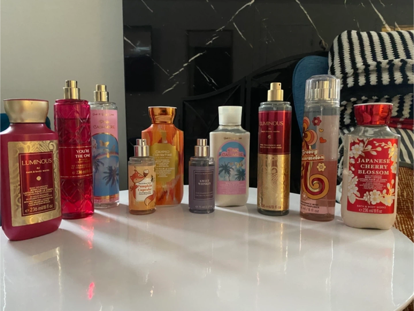 A collection of Bath & Body Works lotions and body mists. Includes Japanese Cherry Blossom, Luminous, Pink Cashmere, and more. All bottles are 8 fl oz or 75 ml. Great for everyday use! Some of them are used but a couple are not touched.