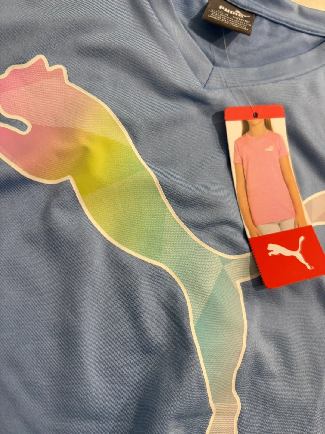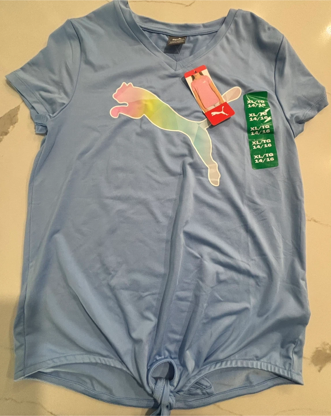 This is a new Puma t-shirt in light blue. It's a size XL/TG (14/16) with a colourful Puma logo graphic. The shirt has a v-neck and a tie knot at the bottom. It's made of polyester blend material. W