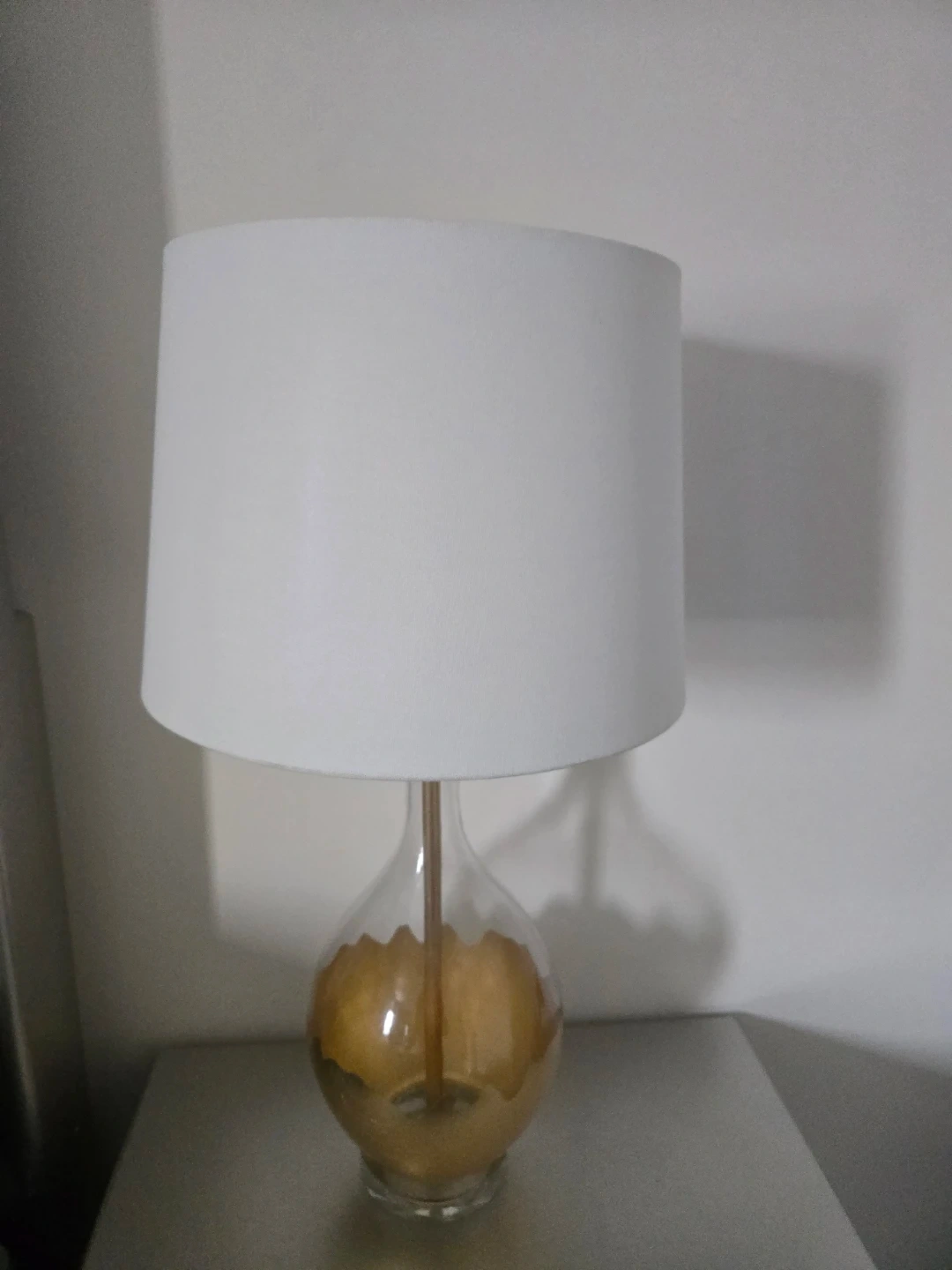 This table lamp features a clear glass base with a gold accent. It's topped with a white fabric shade. Lamp base is made of glass and includes a white fabric shade. Perfect for adding a soft glow to any room!