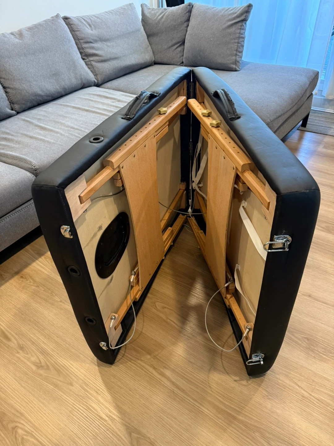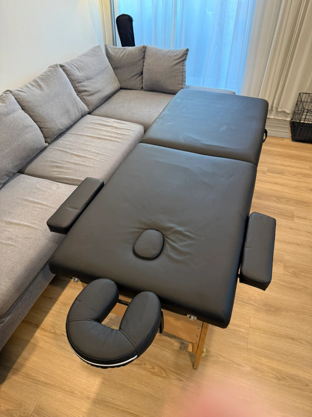 Black vinyl massage table with wooden frame. It includes an adjustable face cradle and arm rests for added comfort. Minor wear on the side, as shown in the photo.