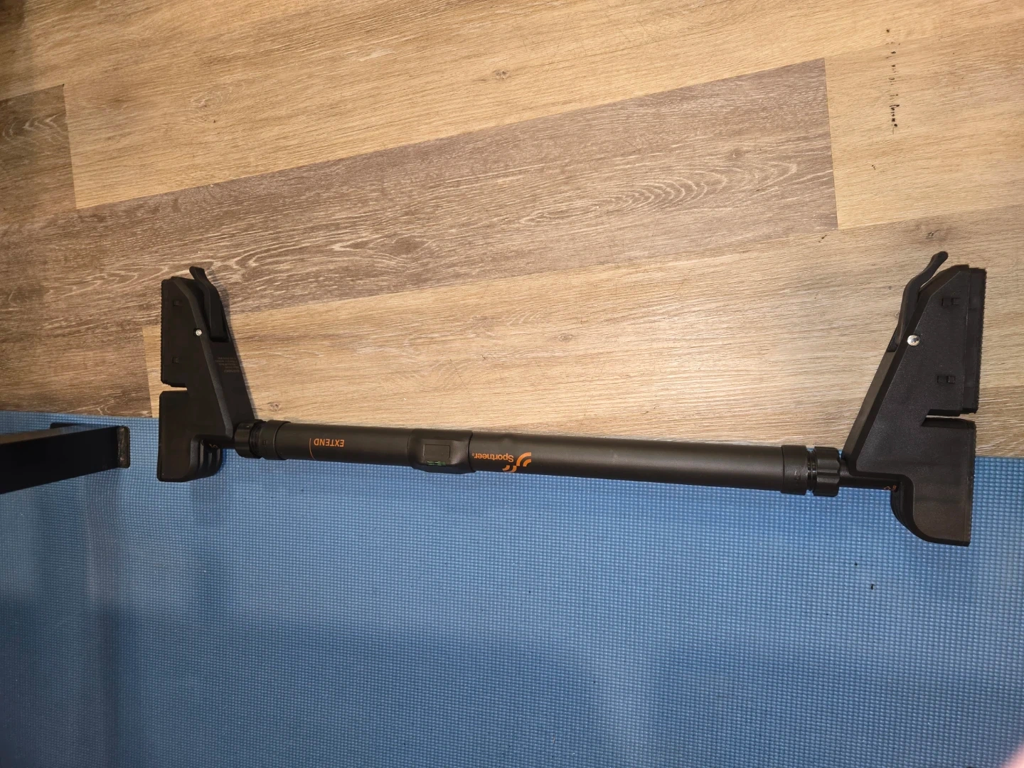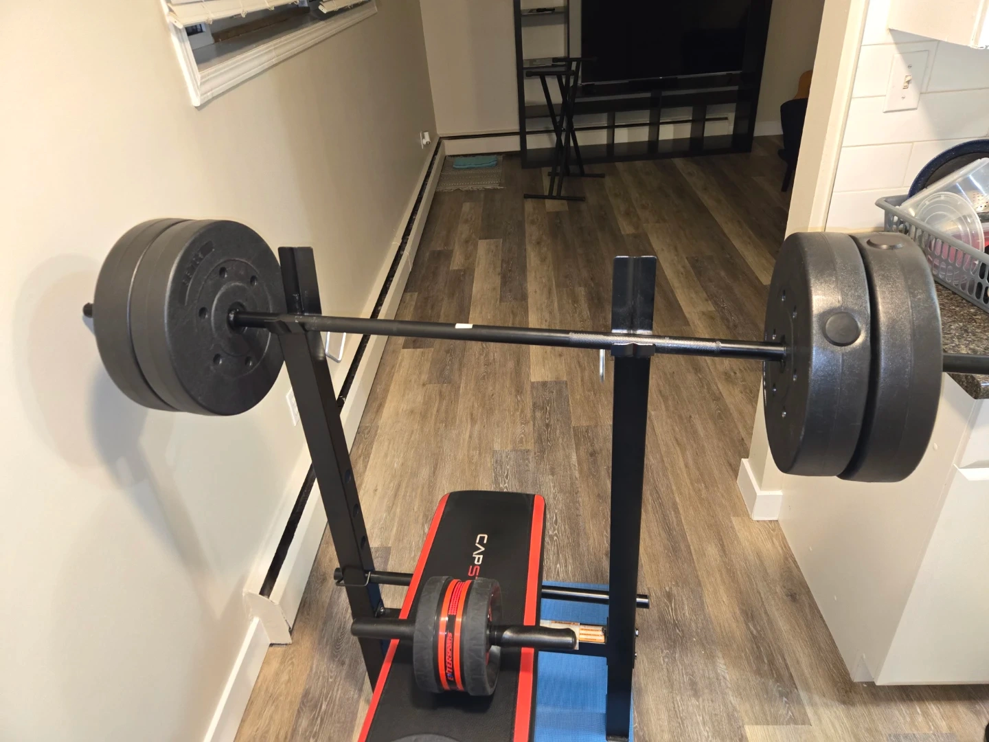 This CAP Barbell weight bench comes with a barbell and various weight plates. The bench itself has a red and black upholstered seat. Includes a total of four 10 lb weight plates and two 20 lb weight plates. A separate attachment labelled 'SportsArt EXTEND' is also included. Great for home workouts!