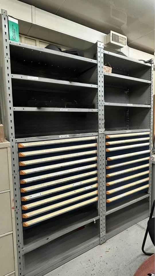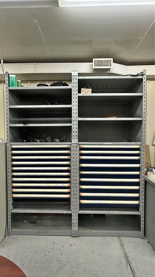 Solid industrial steel storage cabinet with multiple precision-tool drawers and open shelving. Perfect for machine shops, garages, fabrication shops, or anyone needing organized storage for tools, gauges, parts, or hardware. This unit is built for heavy use — drawers slide smoothly, labels are intact, and the frame is extremely sturdy. Great for micrometers, calipers, indicators, gauge blocks, small parts, or general shop organization. Clean, organized, ready for use. Ideal for machining, automotive, fabrication, or hobby shops. Size: 75” x 18” x 89”.
