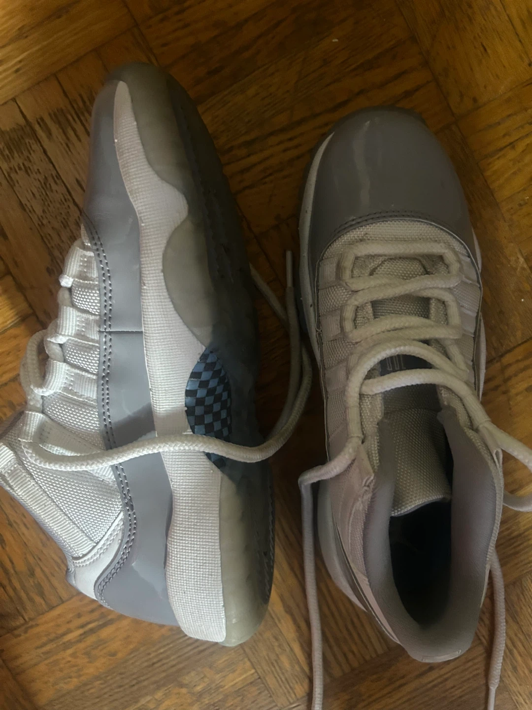 These Air Jordan 11 sneakers are in the popular "Cool Grey" colourway. They feature a patent leather mudguard and a translucent outsole. A checkered pattern is visible under the heel on the sole. Size 4 youth!