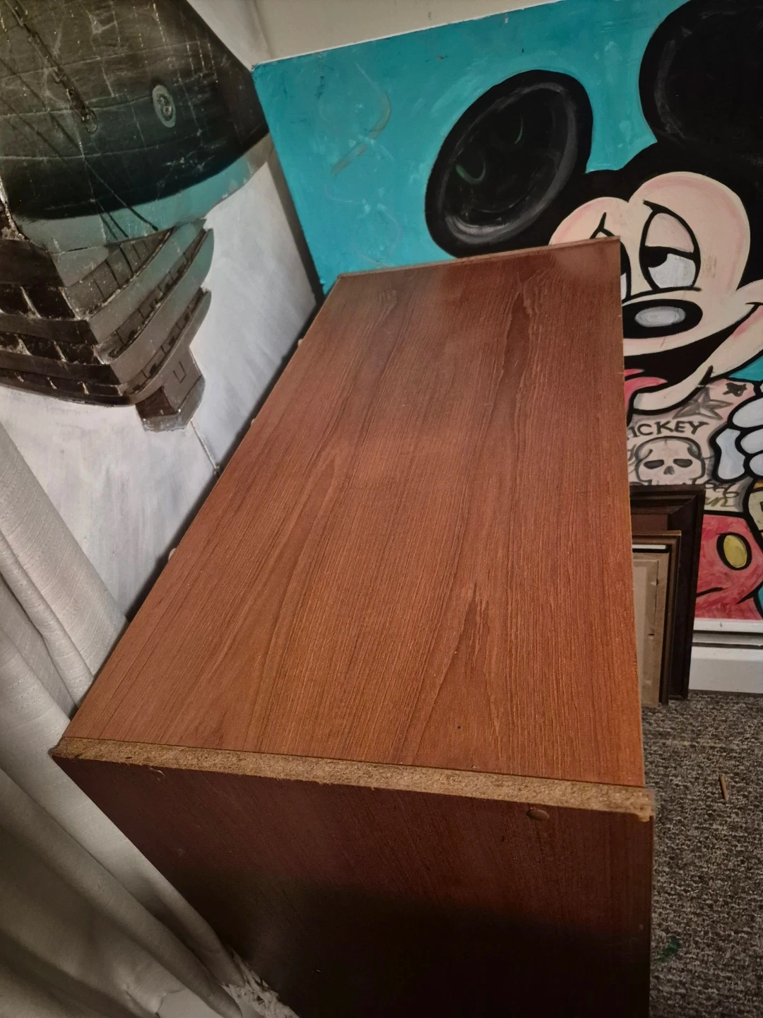 Three tier bookcase with a teak veneer finish. Great for storing books or display items. Two small strips of veneer are missing on the top side edges (visible in photos). This is purely cosmetic and does not affect the structure or usability of the shelf.