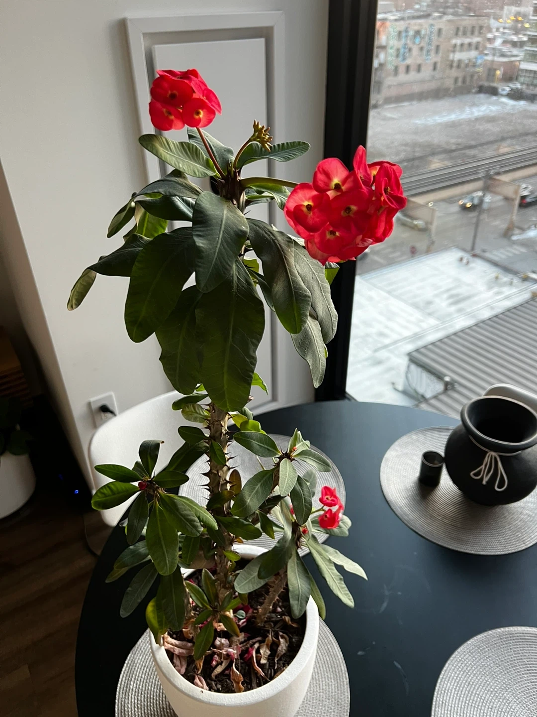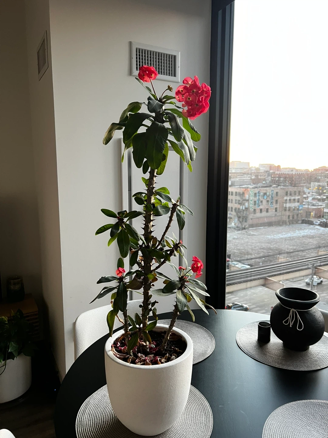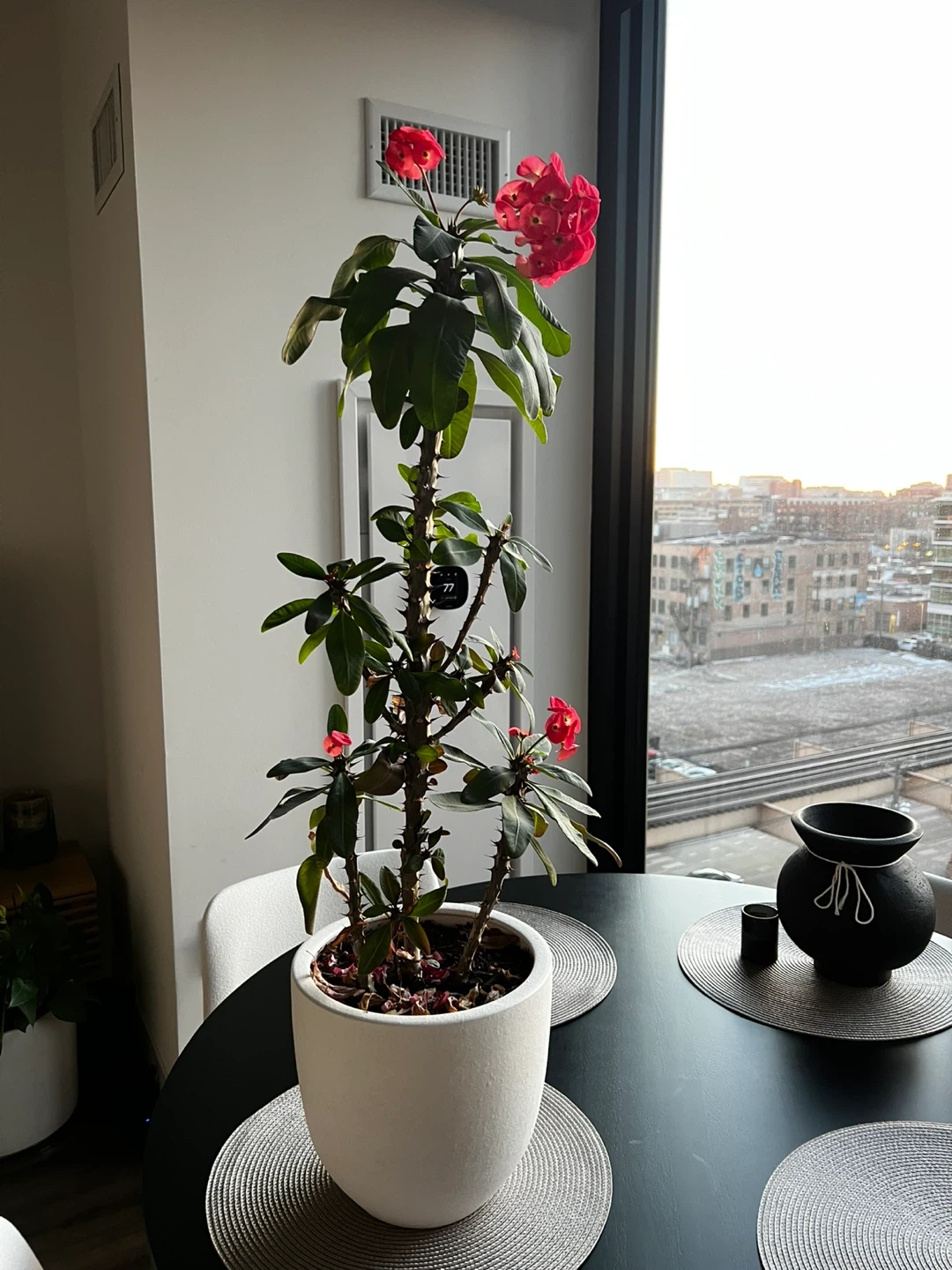 Healthy Euphorbia Milii plant, also known as Crown of Thorns, with vibrant red flowers. It's potted in a stylish white ceramic planter. This plant thrives in bright light and needs occasional watering.