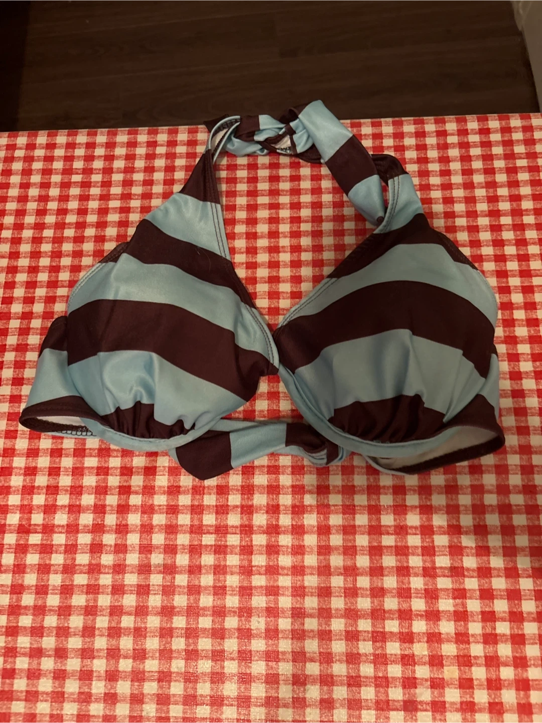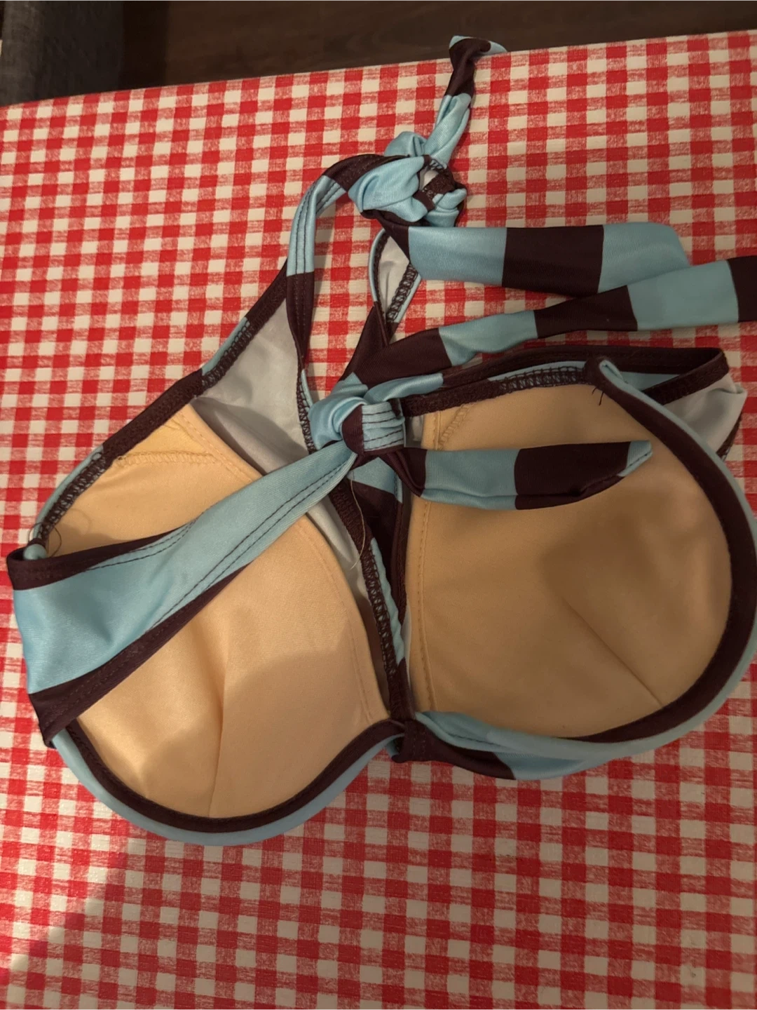 Light blue and brown striped halter bikini top. It's fully lined with a padded bust. Ties at the neck and back. I never used it. It has a skirt. But I didn’t find it. I need to search for it.