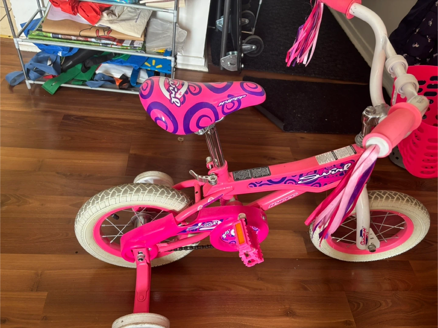 This is a pink Hyper Swirl kids' bike with training wheels. It features streamers and a basket on the handlebars. Perfect for a young rider's first bike!