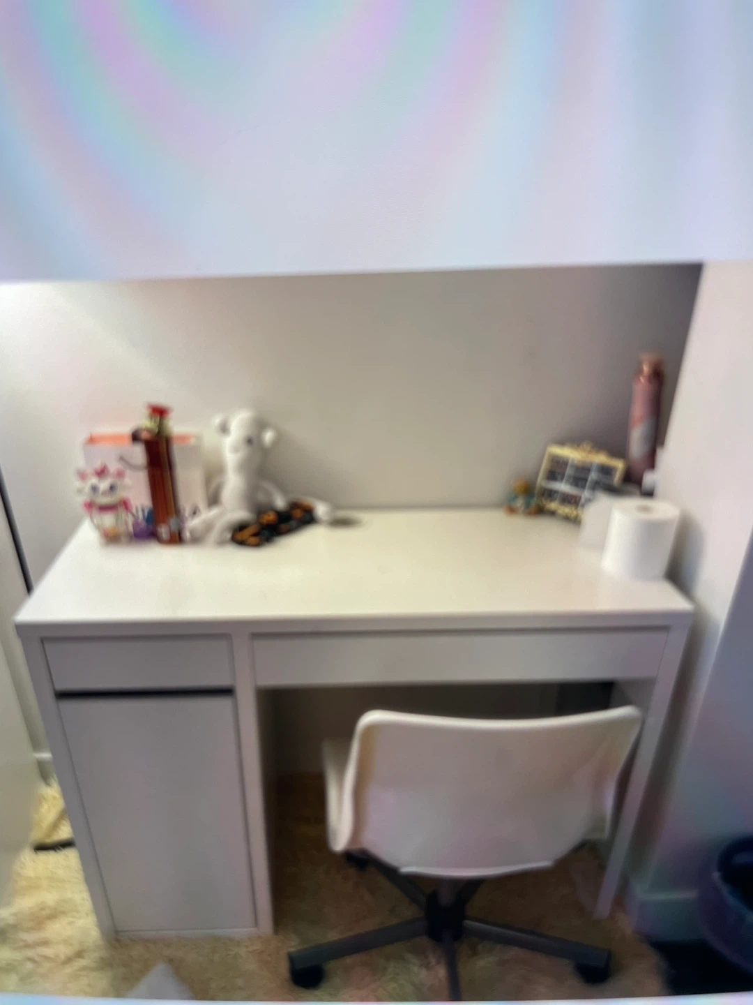 A clean white desk designed for kids, featuring a convenient drawer. Comes with a white swivel chair. Great for homework or creative activities!