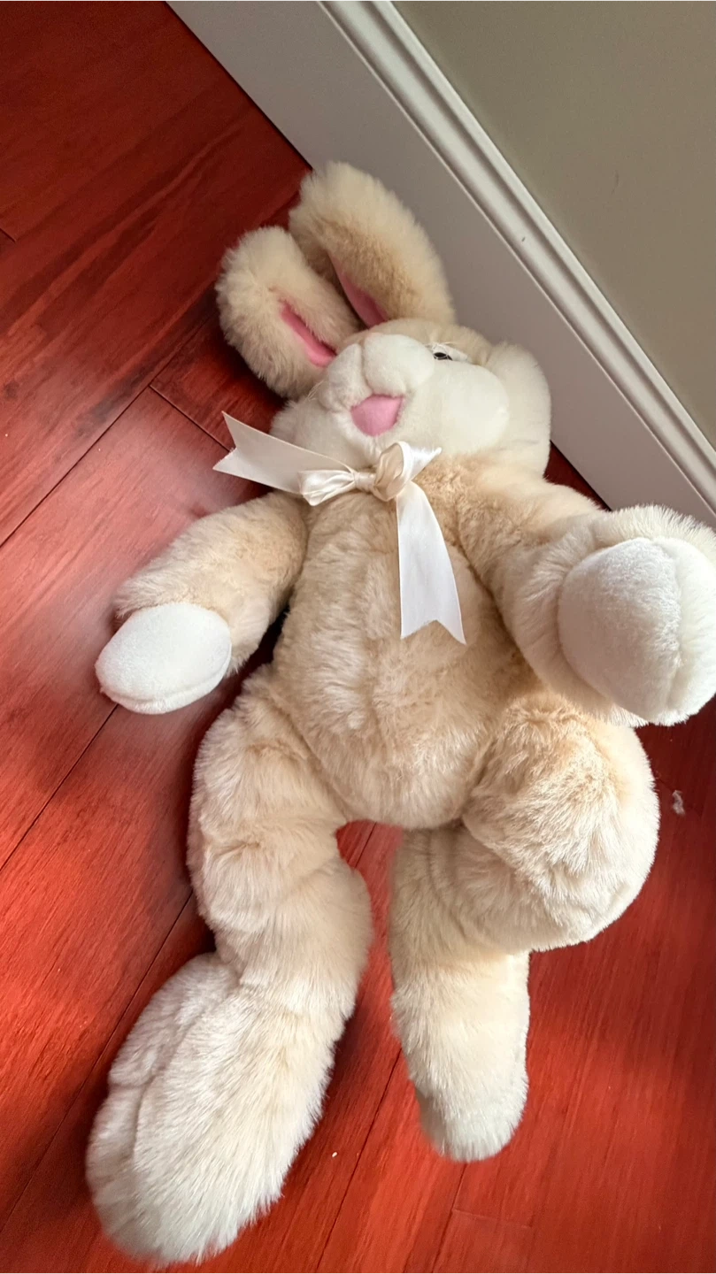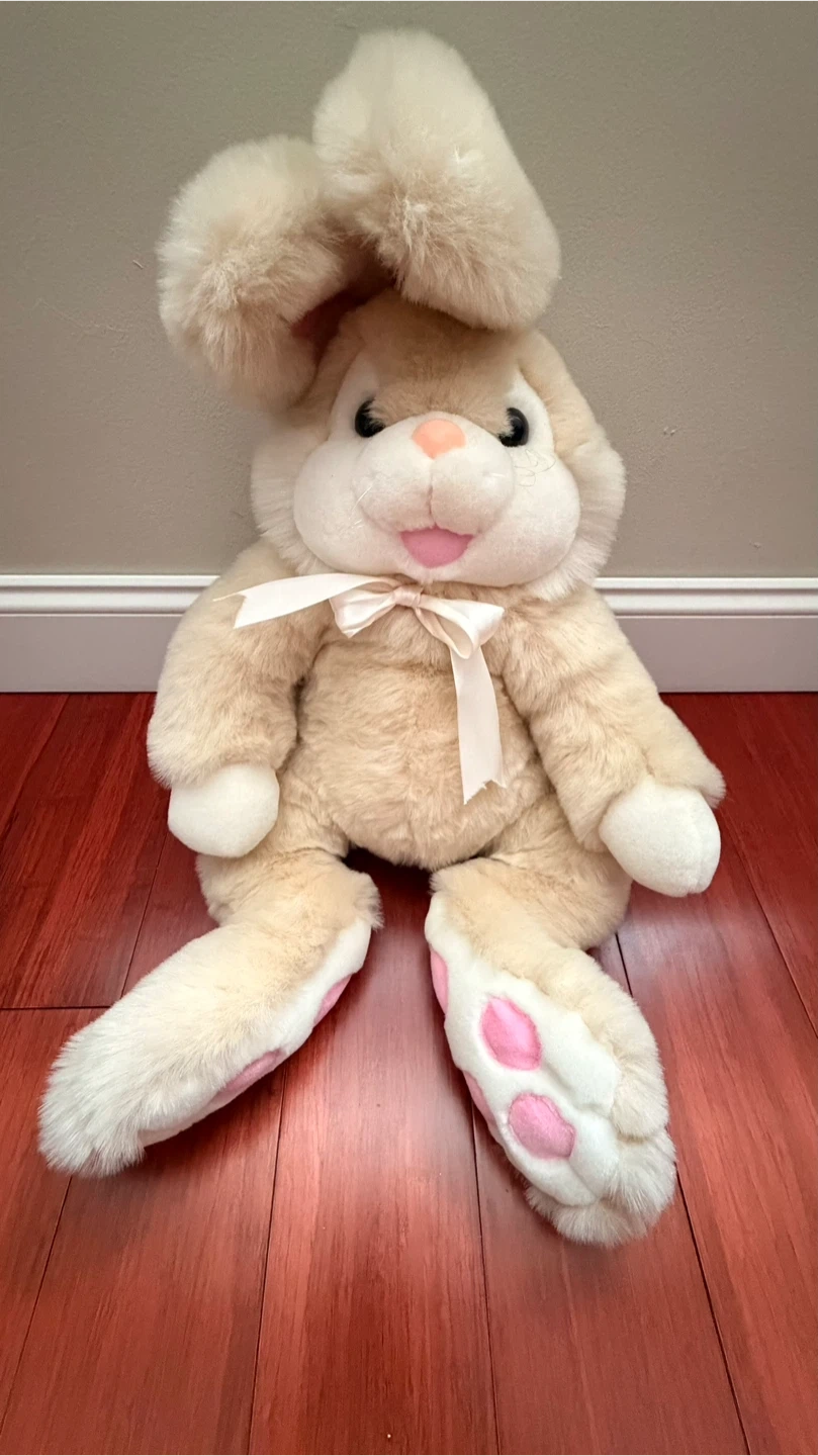 This is a large, soft plush eater bunny toy. It's a tan colour with pink paw pads and an inner ear lining. A satin ribbon is tied into a bow around its neck. The plush material is fuzzy and cuddly.