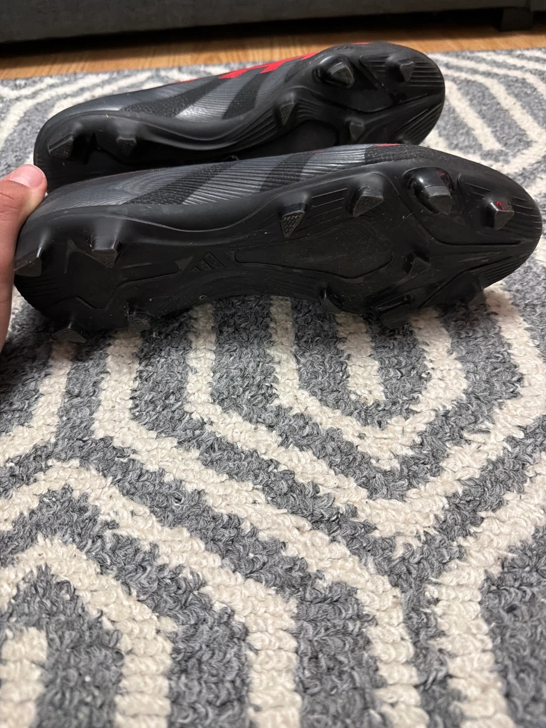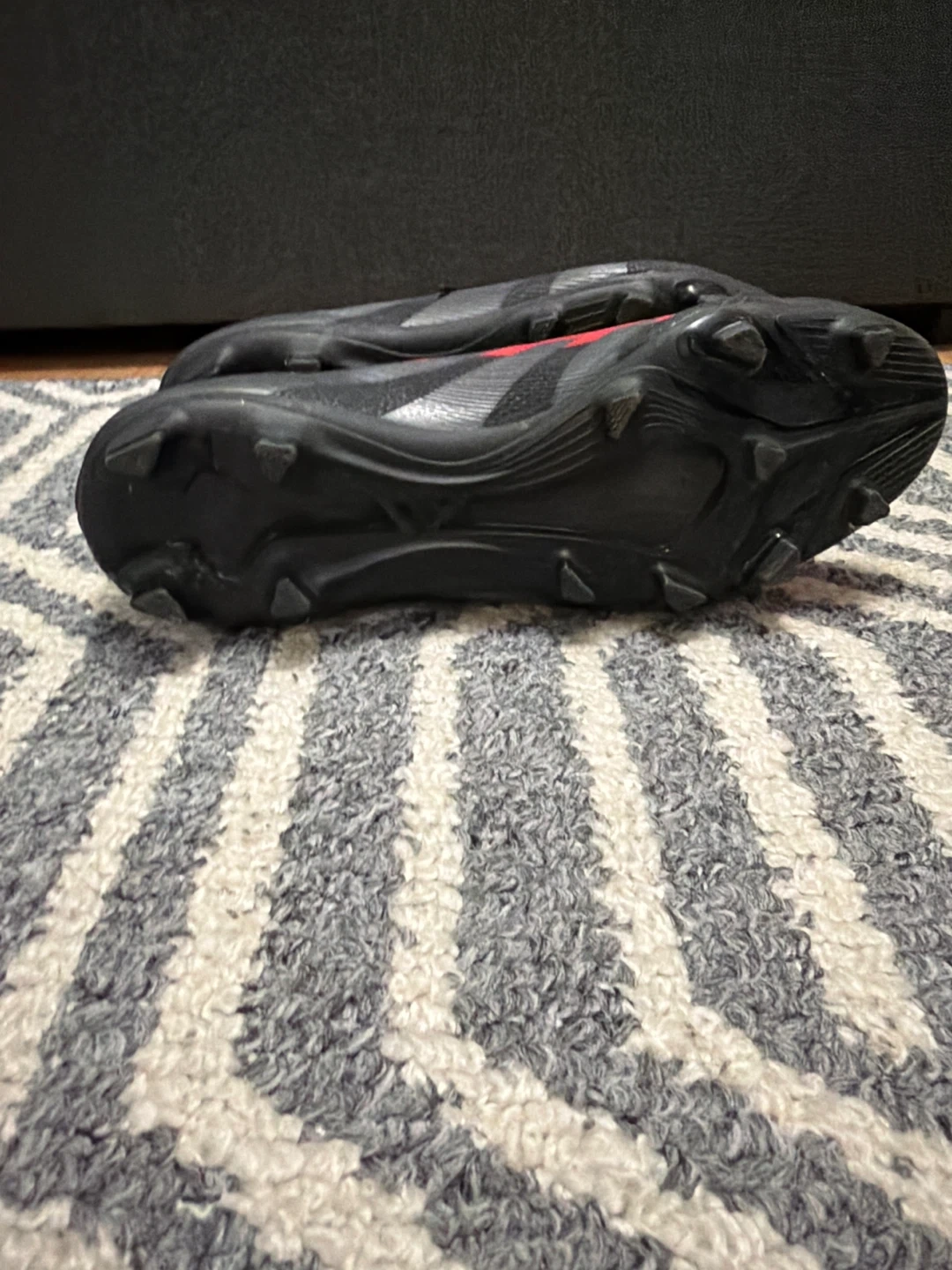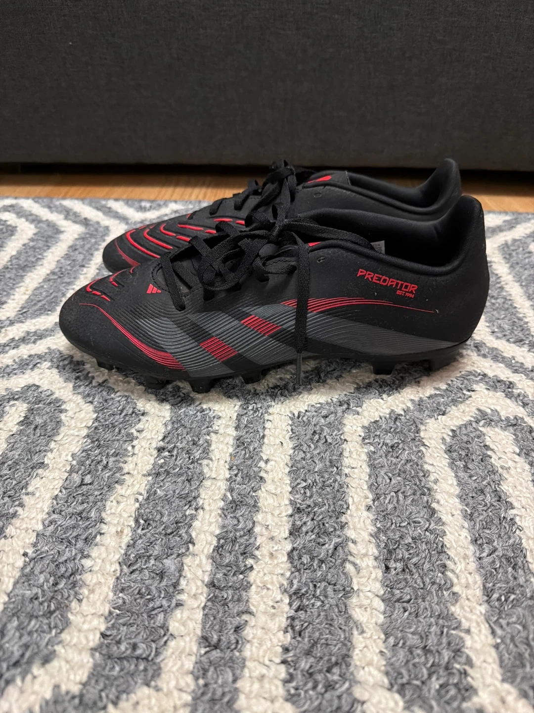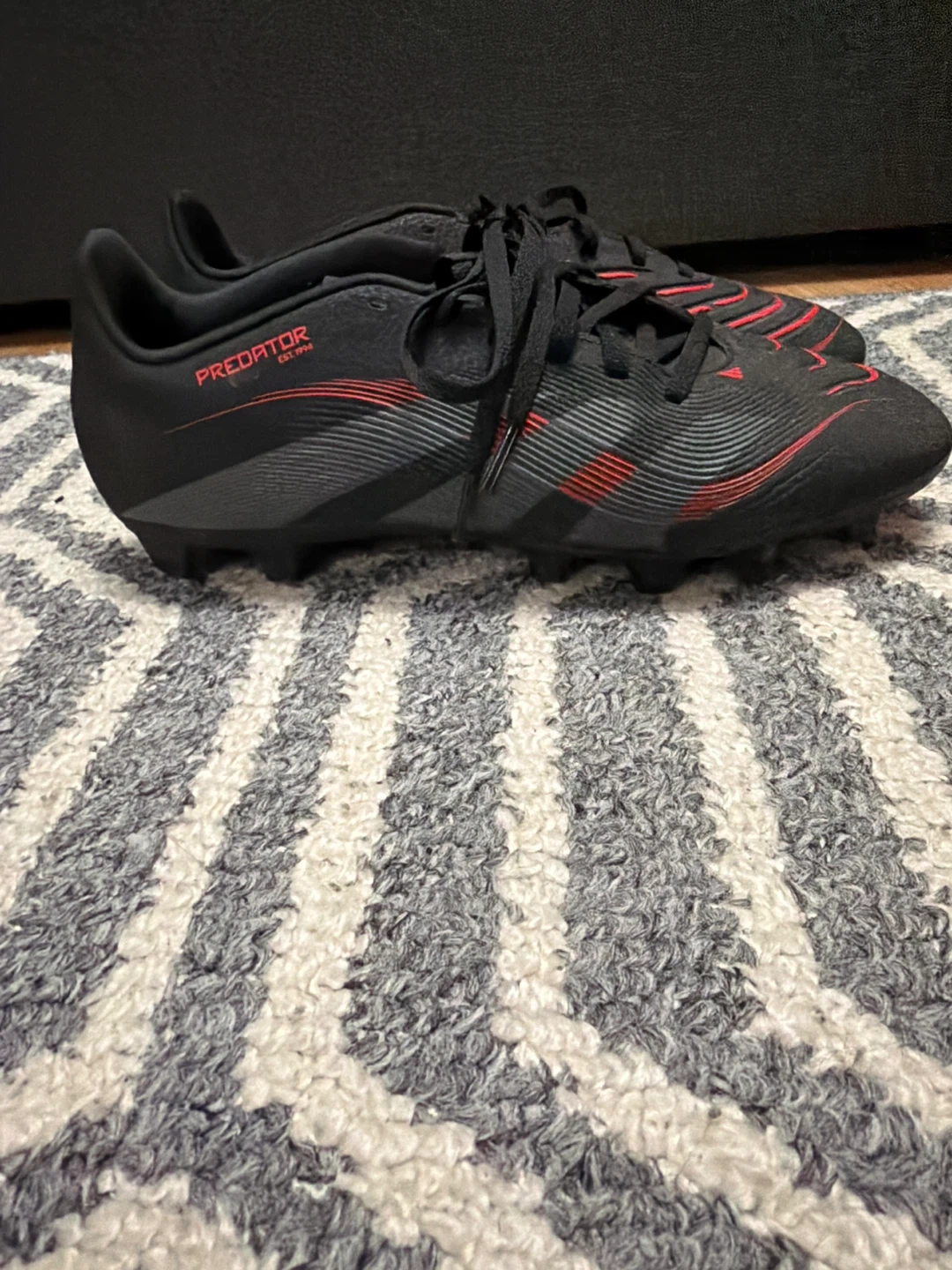 These black Adidas Predator soccer cleats feature red accents. They're designed for the pitch with firm ground studs. Used for playing soccer.