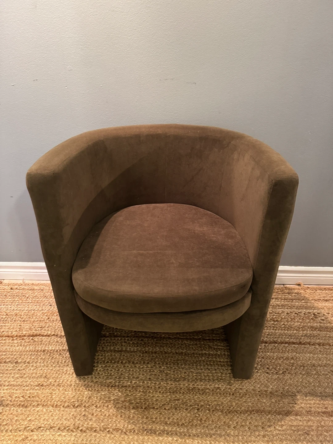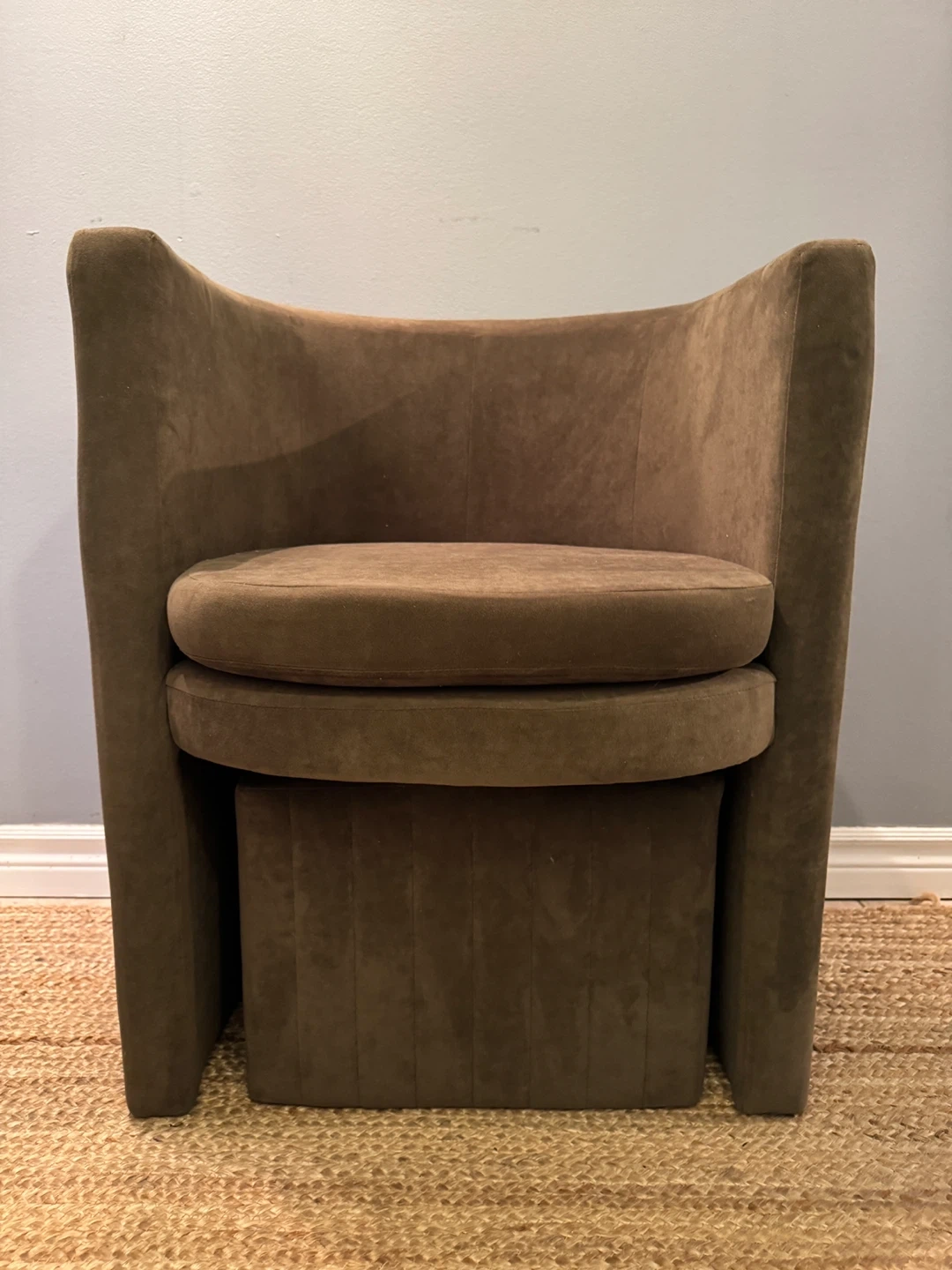 A stylish accent chair and ottoman upholstered in soft olive green velvet fabric. It features a channel tufted design on the backrest and a comfortable round seat. This chair adds a modern touch to any room.