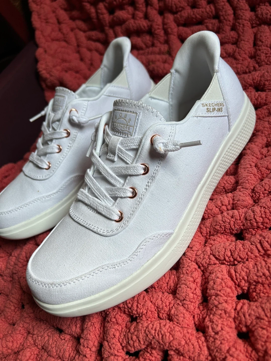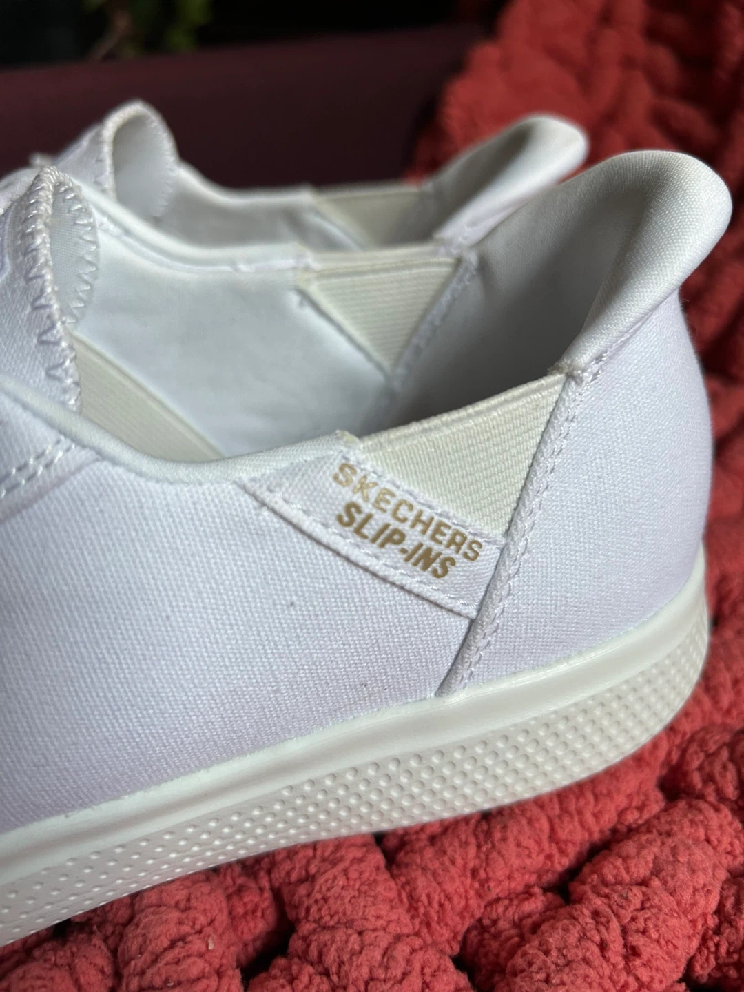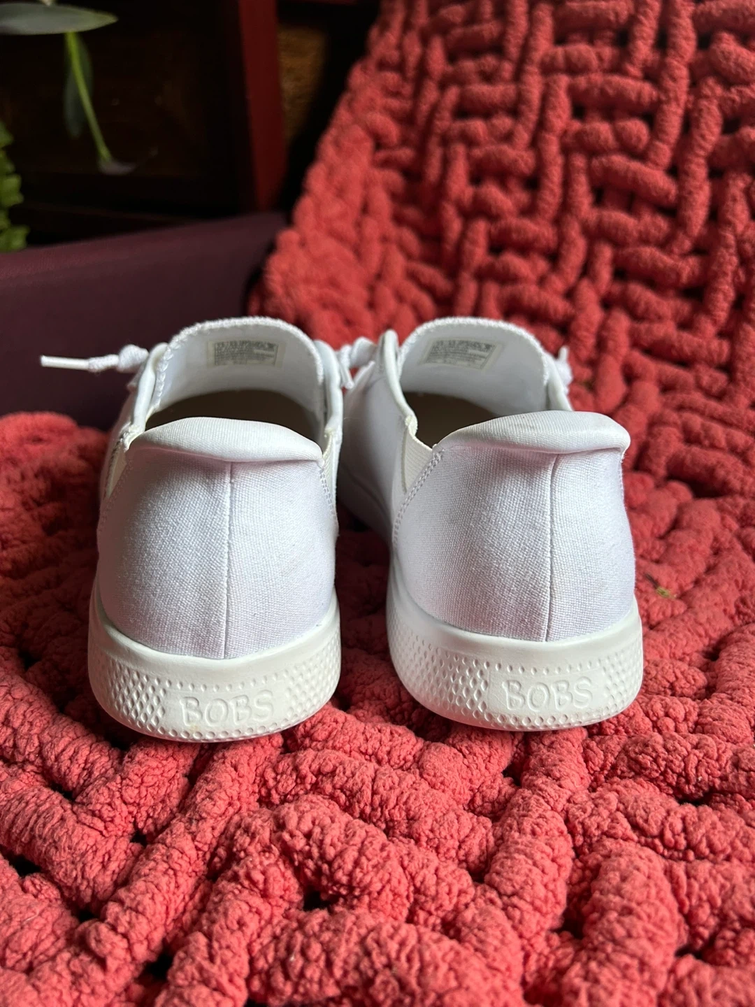 These BOBS from Skechers Slip-ins are a comfortable and casual white sneaker. They feature a canvas upper and easy slip-on design with laces. These are great for everyday wear!