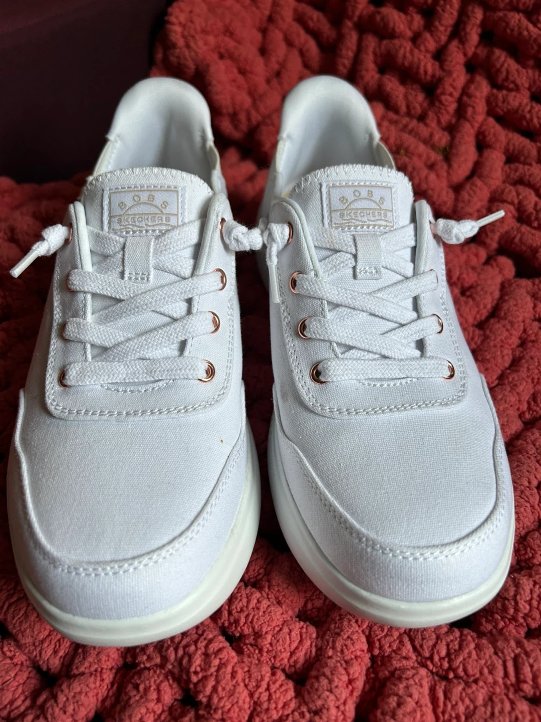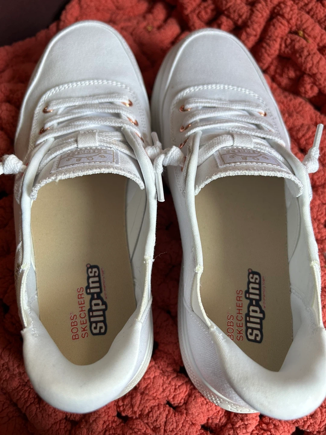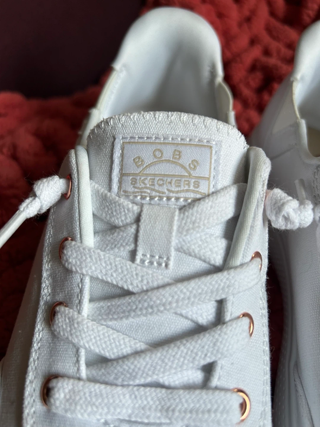 These BOBS from Skechers Slip-ins are a comfortable and casual white sneaker. They feature a canvas upper and easy slip-on design with laces. These are great for everyday wear!