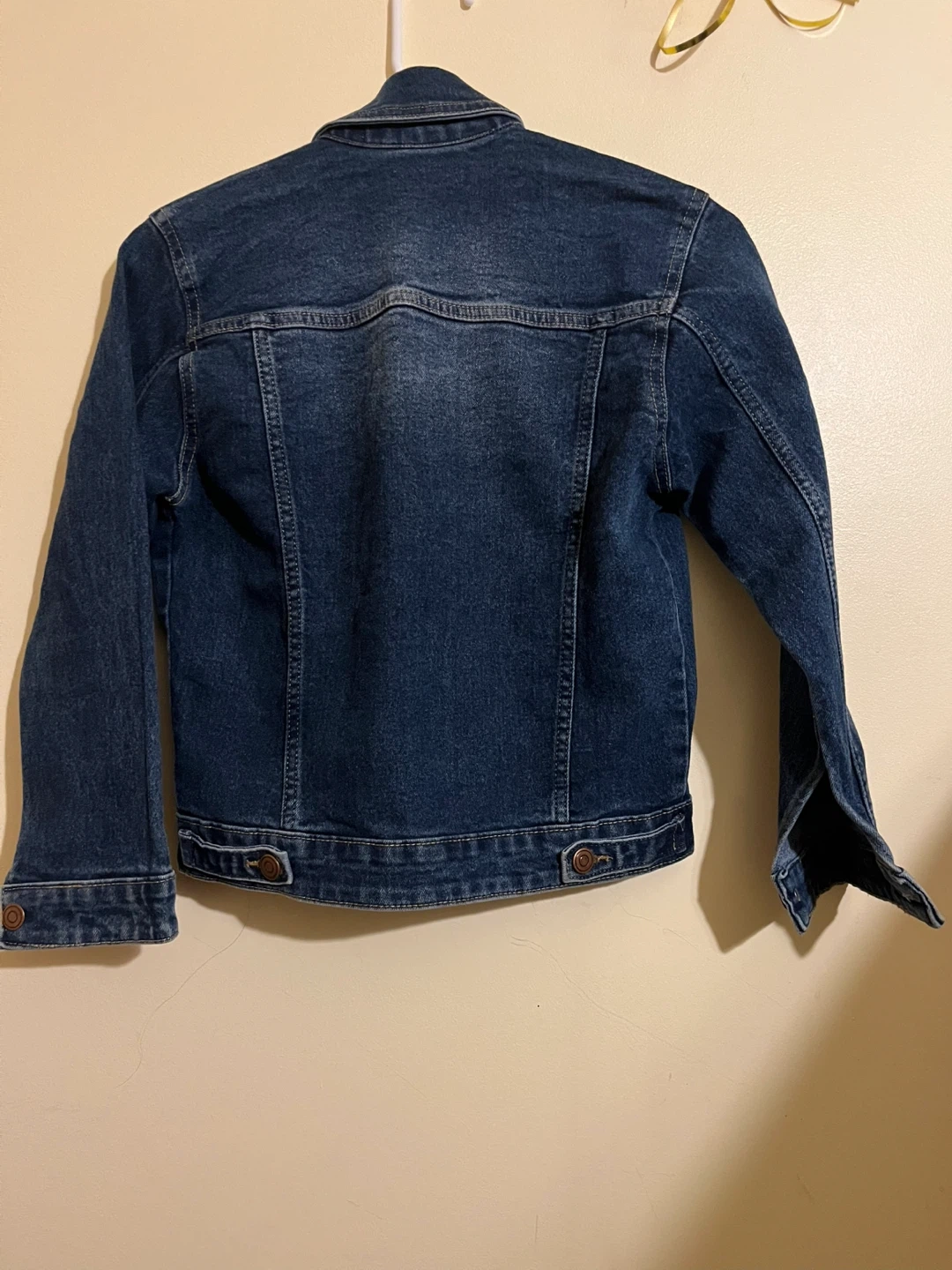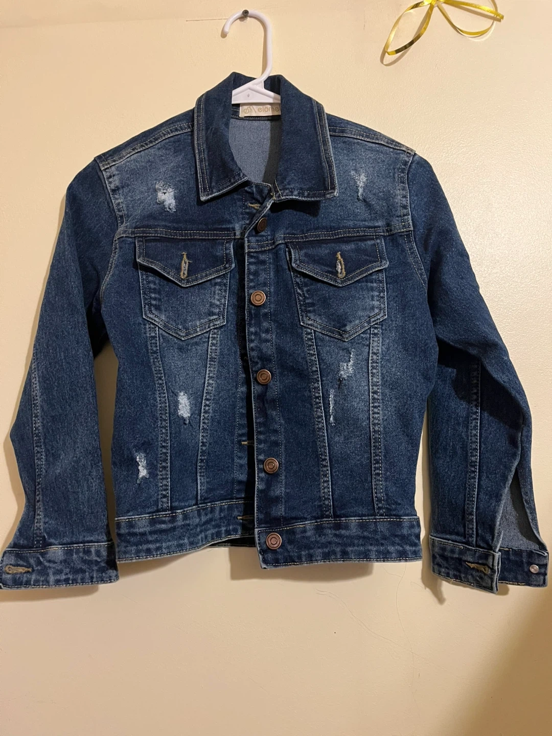 This is a blue denim jacket from Velome. It features a distressed look with rips and fading throughout. The jacket has button closures and chest pockets.