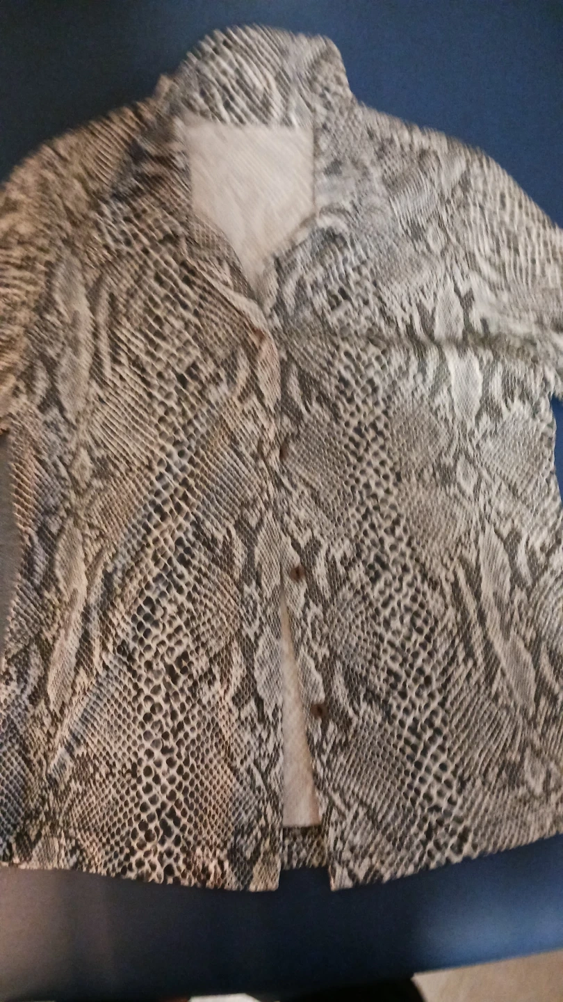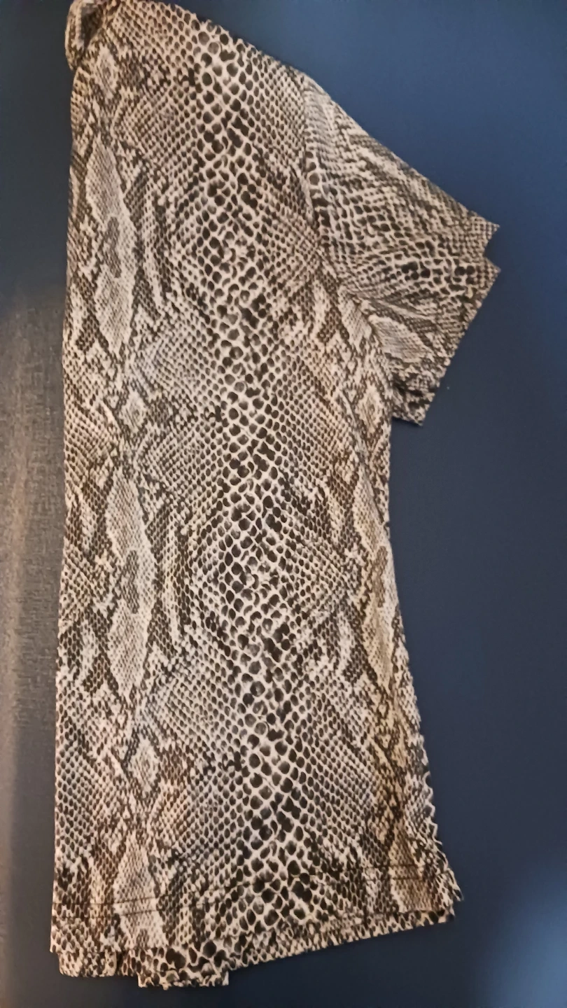 This is a snake print button-up shirt with a collared neckline and short sleeves. It's made from a lightweight jersey fabric and features a button closure. The pattern is a classic black and white snake print.