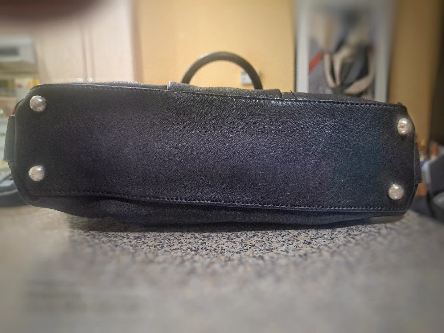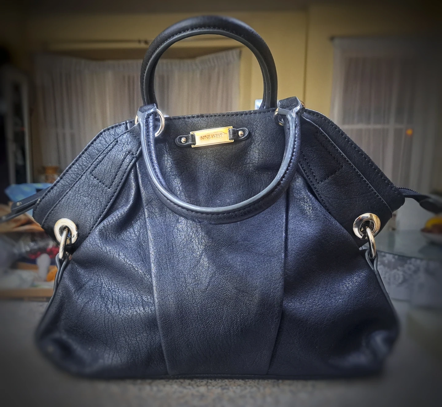 This Nine West handbag is black with a faux leather exterior. It features a striped interior lining and a zip pocket. It's a classic everyday purse for essentials.